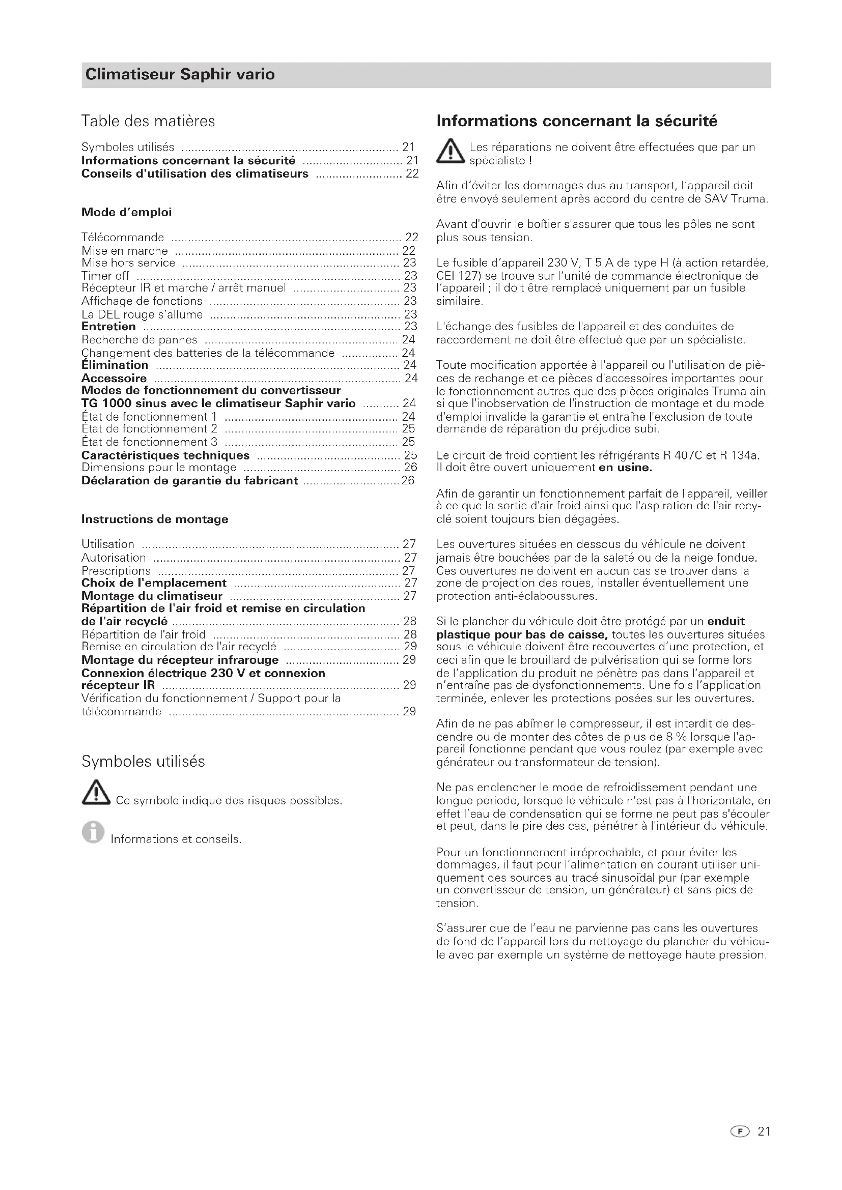 - Insert mains cable plug (15) into socket. The plug is automati- cally provided with strain relief by engaging in a retaining lug. The retaining lug must be lifted with a screwdriver in order to remove the plug from the socket. Insert IR receiver plug into socket (16). The connection (17) is needed if the Saphir vario air con- ditioning unit is being operated via a Truma TG 1000 sinus power inverter (COM connection / communication a or b). Close electronic system cover again and screw the screws (14) back in. The cables must be long enough for the unit to be pulled out of the false floor with the cables attached. All cables must be secured with cable clips! For maintenance or repair work, an isolating device must be provided on the vehicle side to provide all-pole isolation from the mains, with a contact interval of at least 3.5 mm. Function test / Mounting for the remote control Position the mounting for the remote control as close as possible to the receiver (9), in order to allow for the air-condi- tioning system to be operated without removing the remote control from its mounting. In conclusion, all the functions of the device need to be tested in accordance with the Operating Instructions. The operating instructions must be handed to the owner of the vehicle.21 Climatiseur Saphir vario Symboles utilisés Ce symbole indique des risques possibles. Informations et conseils. Informations concernant la sécurité Les réparations ne doivent être effectuées que par un spécialiste ! Afin d‘éviter les dommages dus au transport, l‘appareil doit être envoyé seulement après accord du centre de SAV Truma. Avant d'ouvrir le boîtier s'assurer que tous les pôles ne sont plus sous tension. Le fusible d‘appareil 230 V, T 5 A de type H (à action retardée, CEI 127) se trouve sur l‘unité de commande électronique de l‘appareil ; il doit être remplacé uniquement par un fusible similaire. L'échange des fusibles de l'appareil et des conduites de raccordement ne doit être effectué que par un spécialiste. Toute modification apportée à l'appareil ou l'utilisation de piè- ces de rechange et de pièces d'accessoires importantes pour le fonctionnement autres que des pièces originales Truma ain- si que l'inobservation de l'instruction de montage et du mode d'emploi invalide la garantie et entraîne l'exclusion de toute demande de réparation du préjudice subi. Le circuit de froid contient les réfrigérants R 407C et R 134a. Il doit être ouvert uniquement en usine. Afin de garantir un fonctionnement parfait de l'appareil, veiller à ce que la sortie d'air froid ainsi que l'aspiration de l'air recy- clé soient toujours bien dégagées. Les ouvertures situées en dessous du véhicule ne doivent jamais être bouchées par de la saleté ou de la neige fondue. Ces ouvertures ne doivent en aucun cas se trouver dans la zone de projection des roues, installer éventuellement une protection anti-éclaboussures. Si le plancher du véhicule doit être protégé par un enduit plastique pour bas de caisse, toutes les ouvertures situées sous le véhicule doivent être recouvertes d’une protection, et ceci afin que le brouillard de pulvérisation qui se forme lors de l’application du produit ne pénètre pas dans l’appareil et n’entraîne pas de dysfonctionnements. Une fois l’application terminée, enlever les protections posées sur les ouvertures. Afin de ne pas abîmer le compresseur, il est interdit de des- cendre ou de monter des côtes de plus de 8 % lorsque l'ap- pareil fonctionne pendant que vous roulez (par exemple avec générateur ou transformateur de tension). Ne pas enclencher le mode de refroidissement pendant une longue période, lorsque le véhicule n'est pas à l'horizontale, en effet l’eau de condensation qui se forme ne peut pas s'écouler et peut, dans le pire des cas, pénétrer à l'intérieur du véhicule. Pour un fonctionnement irréprochable, et pour éviter les dommages, il faut pour l’alimentation en courant utiliser uni- quement des sources au tracé sinusoïdal pur (par exemple un convertisseur de tension, un générateur) et sans pics de tension. S’assurer que de l’eau ne parvienne pas dans les ouvertures de fond de l’appareil lors du nettoyage du plancher du véhicu- le avec par exemple un système de nettoyage haute pression. Table des matières Symboles utilisés p. 21