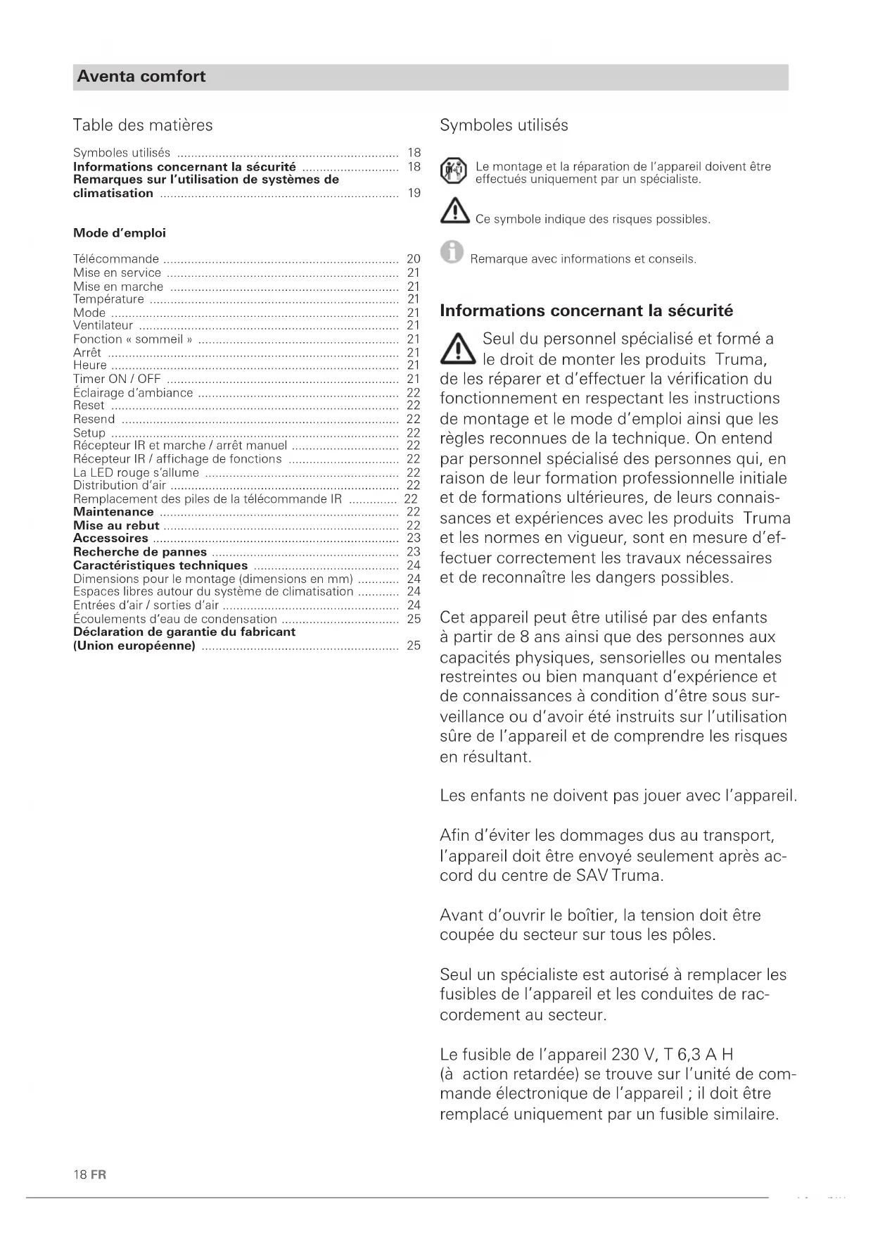 - The warranty must be claimed with an authorised service part- ner or at the Truma Service Centre. All the relevant addresses and phone numbers can be found at www.truma.com, in the “Service” section. To ensure a smooth procedure, we would be grateful if you could have the following details ready before contacting us: – Detailed description of the defect – Serial number of the unit – Date of purchase The authorised service partner or the Truma Service Centre will then specify the further procedure. To avoid transport damage, the affected unit must only be shipped by prior ar- rangement with the authorised service partner or the Truma Service Centre. If the warranty claim is recognised by the Manufacturer, then the transport expenses shall be borne by the same. If no warranty claim is applicable, the Consumer will be notified accordingly and any repair and transport expenses shall then be the Consumer’s liability. We ask you not to send in a unit without prior arrangement.18 FR Aventa comfort Symboles utilisés Le montage et la réparation de l’appareil doivent être effectués uniquement par un spécialiste. Ce symbole indique des risques possibles. Remarque avec informations et conseils. Informations concernant la sécurité Seul du personnel spécialisé et formé a le droit de monter les produits Truma, de les réparer et d’effectuer la vérification du fonctionnement en respectant les instructions de montage et le mode d’emploi ainsi que les règles reconnues de la technique. On entend par personnel spécialisé des personnes qui, en raison de leur formation professionnelle initiale et de formations ultérieures, de leurs connais- sances et expériences avec les produits Truma et les normes en vigueur, sont en mesure d’ef- fectuer correctement les travaux nécessaires et de reconnaître les dangers possibles. Cet appareil peut être utilisé par des enfants à partir de 8 ans ainsi que des personnes aux capacités physiques, sensorielles ou mentales restreintes ou bien manquant d’expérience et de connaissances à condition d’être sous sur- veillance ou d’avoir été instruits sur l’utilisation sûre de l’appareil et de comprendre les risques en résultant. Les enfants ne doivent pas jouer avec l’appareil. Afin d’éviter les dommages dus au transport, l’appareil doit être envoyé seulement après ac- cord du centre de SAV Truma. Avant d’ouvrir le boîtier, la tension doit être coupée du secteur sur tous les pôles. Seul un spécialiste est autorisé à remplacer les fusibles de l’appareil et les conduites de rac- cordement au secteur. Le fusible de l’appareil 230 V, T 6,3 A H (à action retardée) se trouve sur l’unité de com- mande électronique de l’appareil ; il doit être remplacé uniquement par un fusible similaire. Table des matières Symboles utilisés p. 18