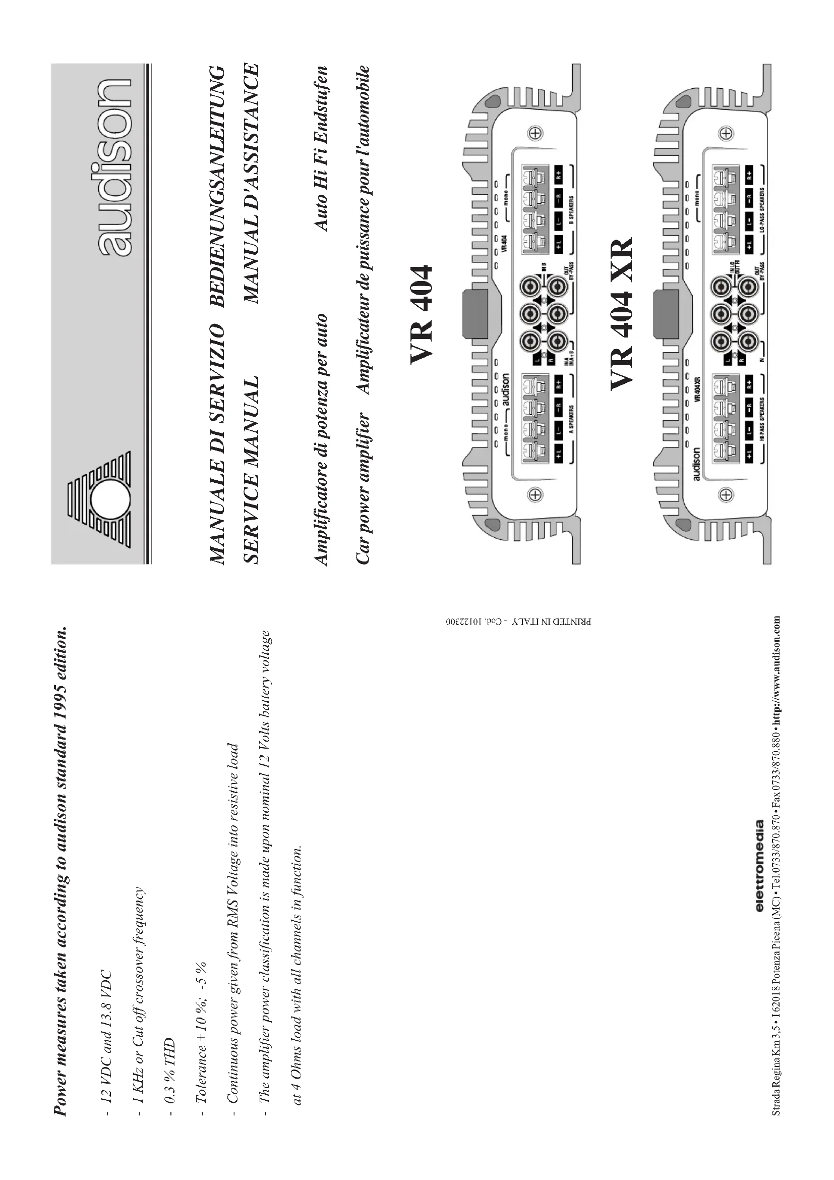 VR 404, VR 404XR. Amplificateurs à 4 canaux aux performances acoustiques très élevées. Chaque aspect, qu'il soit fonctionnel, acoustique ou esthétique a fait l'objet de soins très particuliers qui ne se limitent pas au seul choix de techniques innovatrices mais concernent également l'emploi de matériel aux dettes bonne qualité, l'importance accordée aux moindres petits détails et l'introduction de fonctions accessoires visant à faciliter au maximum l'utilisation des apparêls. L'alimentation de type PWM utilise des transistors MOSFET permettant d'obtenir une grande puissance sans risque de flèchissements lorsque la batterie subit une baisse de voltage. Le stade final est configuré à l'entrée par un couple complémentaire de différents polarisés à courant constant (par des diodes LED), ce qui implique des avantages évidents en ce qui concern la stabilité et la précision du timbre.