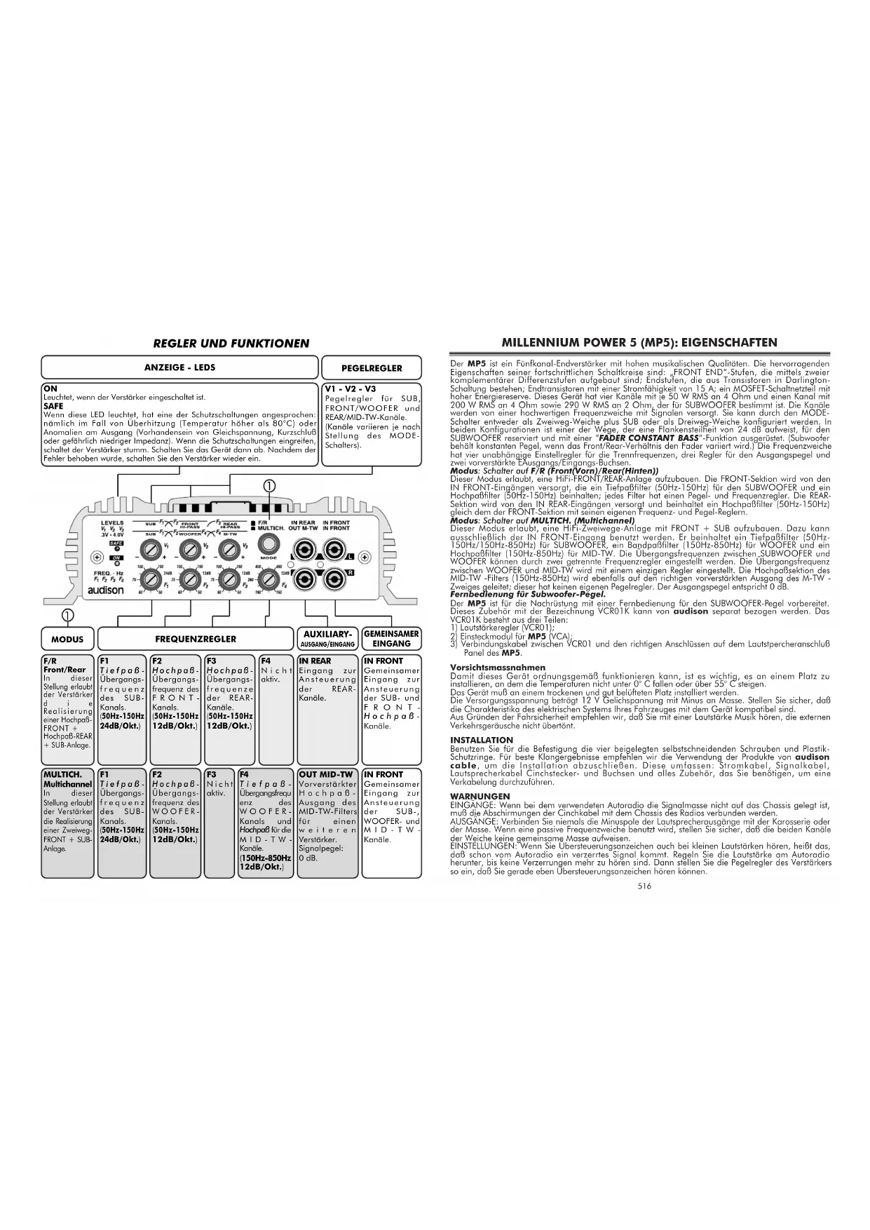 MILLENNIUM POWER 5 (MP5): CARACTÉRISTIQUES MP5 . C’est un amplificateur à cinq voies aux performances musicales élevées. Les éléments fondamentaux de ce circuit d’exception sont: stades “FRONT END” réalisés avec deux stades différentiels complémentaires, stades finals constitués de transistors en connexion Darlington, transistors finals avec une capacité en courant équivalente à 15 A et une alimentation PWM à MOSFETS à grande réserve d’énergie. L’appareil dispose de quatre voies de 50 W RMS sur 4 Ohm et d’une voie spéciale pour le SUBWOOFER de 200 W RMS sur 4 Ohm et 290 W RMS sur 2 Ohm. Les voies sont soumises à un filtre actif exceptionnel réglabe sur deux ou trois voies par le bouton Mode; dans l’une ou l’autre disposition, une voie, qui a une pente de coupe de 24 dB, est consacrée au SUBWOOFER, qui dispose même de la fonction FADER CONSTANT BASS (niveau constant du Subwoofer lorsque le niveau Front/Rear est varié par le réglage Fader). Le filtre actif dispose de quatre réglages indépendants pour les fréquences de coupe, trois réglages pour les niveaux de sortie, deux connecteurs d’entrée/sortie préamplifiée. Mode: Bouton de commande positionné sur F/R (Front/Rear) (Avant/Arrière). Il permet de réaliser une installation HI-FI du type FRONT-REAR. La section FRONT est commandée par l’entrée IN FRONT qui gère un filtre Lo pass (50Hz - 150Hz) pour SUBWOOFER et un filtre Hi pass (50Hz - 150Hz), disposant chacun d’un contrôle de fréquence et de niveau. La section REAR est commandée par l’entrée IN REAR qui gère un filtre Hi pass (50Hz - 150Hz) identique à celui de la section FRONT, avec son propre contrôle de fréquence et de niveau. Mode: bouton de commande positionné sur MULTICH. (Multichannel). Il permet de réaliser une installation HI-FI de type uniquement FRONT à deux voies + SUB. Entrée simple utilisable IN FRONT qui gére un filtre Lo pass (50Hz - 150Hz) pour SUBWOOFER, un filtre Band pass pour WOOFERS (50Hz - 150Hz /150Hz - 850Hz) et un filtre Hi pass pour MID-TW (150Hz - 850 Hz). Les fréquences de coupe entre SUBWOOFER et WOOFER sont gérées par boutons de réglage de fréquence indépendants; la fréquence de coupe entre WOOFER et MID-TW est controllée par un simple bouton de réglage. Chacune des trois sorties de puissance est réglée par un propre contrôle de niveau. La section Hi-pass du filtre MID-TW (150Hz - 850Hz) est reproduite sur la sortie adéquate préamplifiée OUT M-TW et ne dispose pas de bouton de réglage du volume; le niveau de sortie est équivalent à 0 dB. Sub remote volume control. MP5 est conçu pour l’éventuel ajout d’un kit accessoire pour le contrôle externe du volume du SUB. Cet accessoire, appelé VCR 01 K, est fourni séparément par audison. Le VCR01K se compose de trois parties: