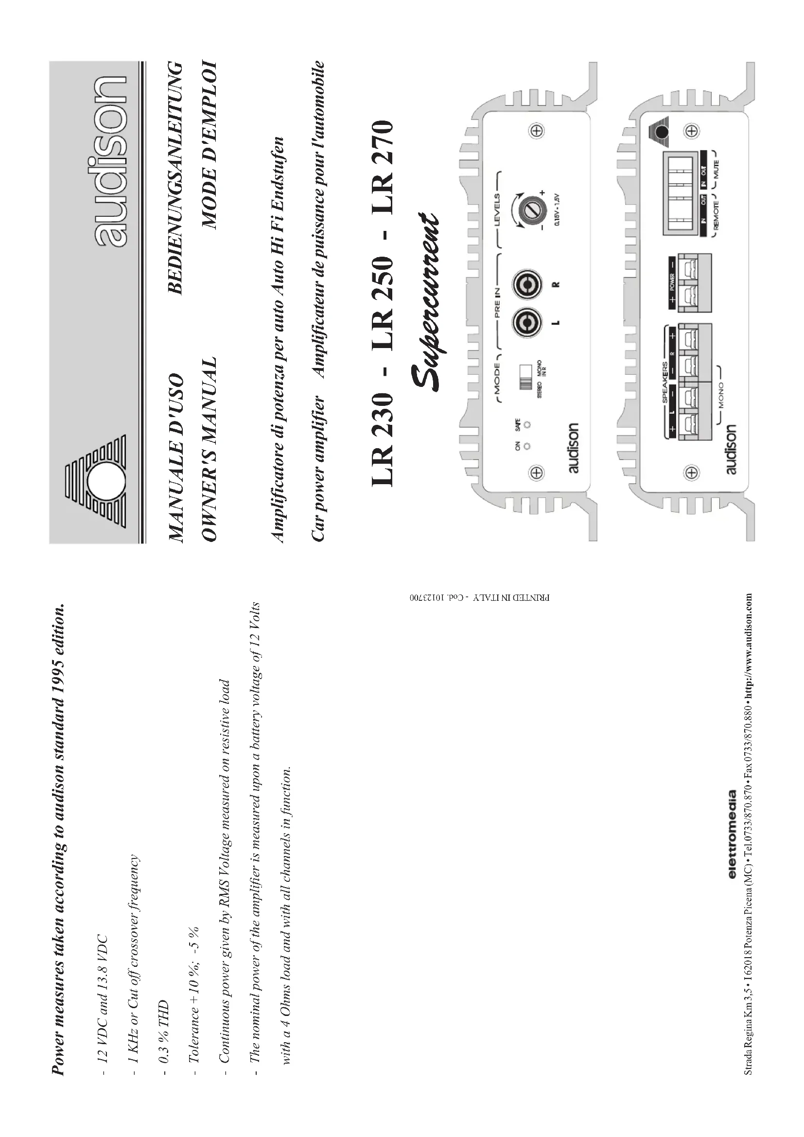 La série Supercurrent: LR 230, LR 250, LR 270. Amplis à deux canaux de dimensions compactes à haute des caractériques musicales. Les principaux éléments de leur circuit sophistique sont: stades «front end» réalisés avec deux stades différentiels complémentaires polarisés par deux générateurs de courant constant à bas bruit. La configuration du stade final est faite d'une triplette inversée à symétrie pure; l'amplificatuer de puissance est réalisé par un parallelele de transistors, cha cun avec capacité en courant de 15 A. L'alimentation PWM à MOSFET a été particulièrement étudie pour fournir des courants élevés au niveau des stade d'amplification. Ces caractéristiques permettent une grande capacité pour piloter des charges très basses. C'est pour cette raison que cette gamme d'appareils a été appelée Supercurrent, pour leur facilité à piloter des charges avec une impédance de 1 Ohm si connectés en stéreo et de 2 Ohm si connectés en mono à pont. Bien entendu, comme il s'agi d'amplis de dimensions très compactes par rapport aux performances qu'ils offrent, lorsqu'ils sont utilisés sur des charges très basses, il faut désir un endroit bien aéré pour leur installation oumettre un ventilateur de refroidissement pres d'eux pour éviter des surchauffes excessives.