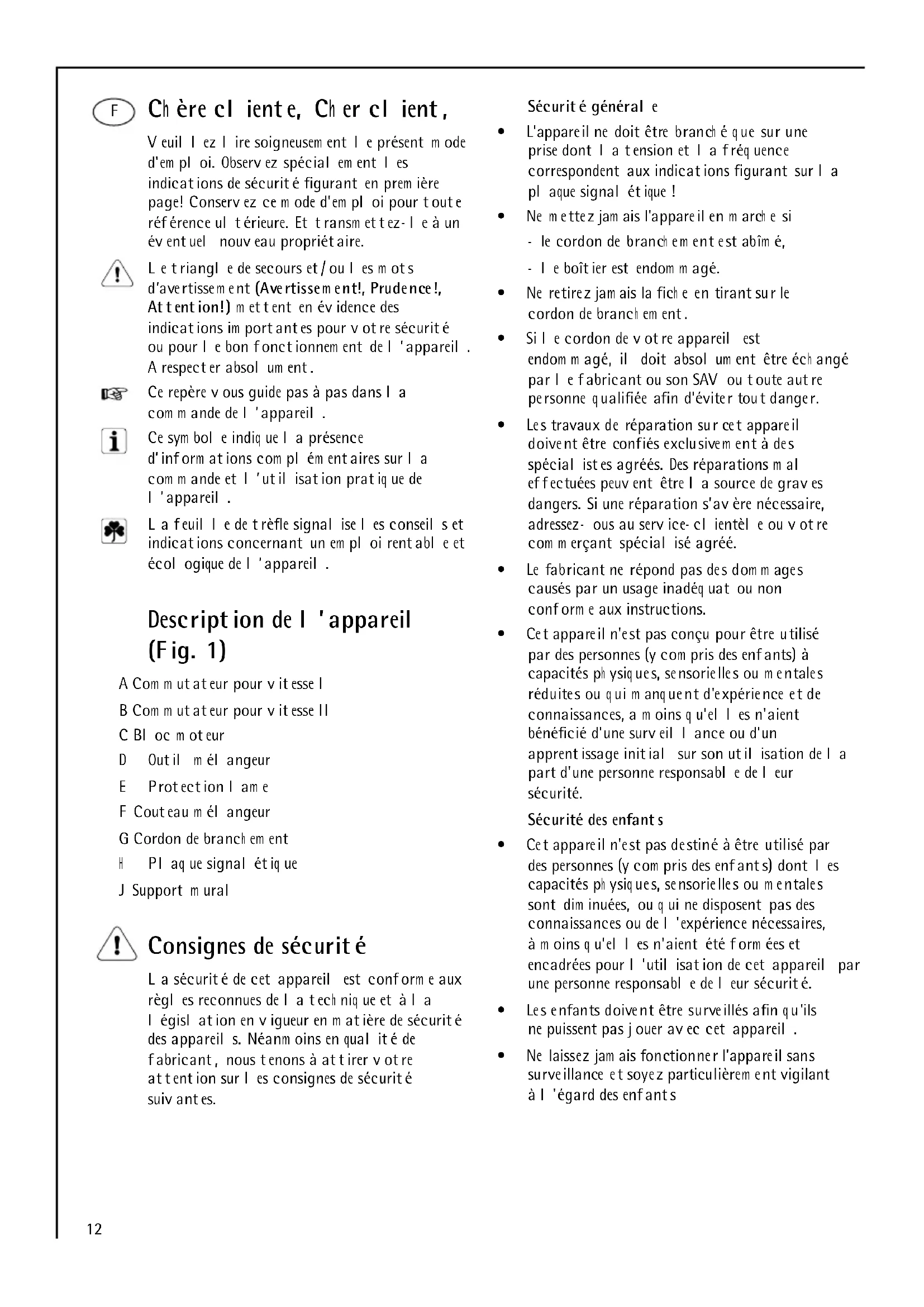 - EM C Directive 89 /336/EEC w ith am endm ents 9 2/31/EEC and 9 3/68/EEC12 Ch ère cliente, Ch er client, Veuillez lire soigneusem ent le présent m ode d'em ploi. Observez spécialem ent les indications de sécurité figurant en prem ière page! Conservez ce m ode d'em ploi pour toute référence ultérieure. Et transm ettez- le à un éventuel nouveau propriétaire. Le triangle de secours et/ou les m ots d’avertissem ent (Avertissem ent!, Prudence!, Attention!) m ettent en évidence des indications im portantes pour votre sécurité ou pour le bon fonctionnem ent de l’appareil. A respecter absolum ent. Ce repère vous guide pas à pas dans la com m ande de l’appareil. Ce sym bole indiq ue la présence d’inform ations com plém entaires sur la com m ande et l’utilisation pratiq ue de l’appareil. La feuille de trèfle signalise les conseils et indications concernant un em ploi rentable et écologique de l’appareil. Description de l’appareil (Fig. 1) A Com m utateur pour vitesse I B Com m utateur pour vitesse II C Bloc m oteur D Outil m élangeur E Protection lam e F Couteau m élangeur G Cordon de branch em ent H Plaq ue signalétiq ue J Support m ural Consignes de sécurité La sécurité de cet appareil est conform e aux règles reconnues de la tech niq ue et à la législation en vigueur en m atière de sécurité des appareils. Néanm oins en qualité de fabricant, nous tenons à attirer votre attention sur les consignes de sécurité suivantes. Sécurité générale