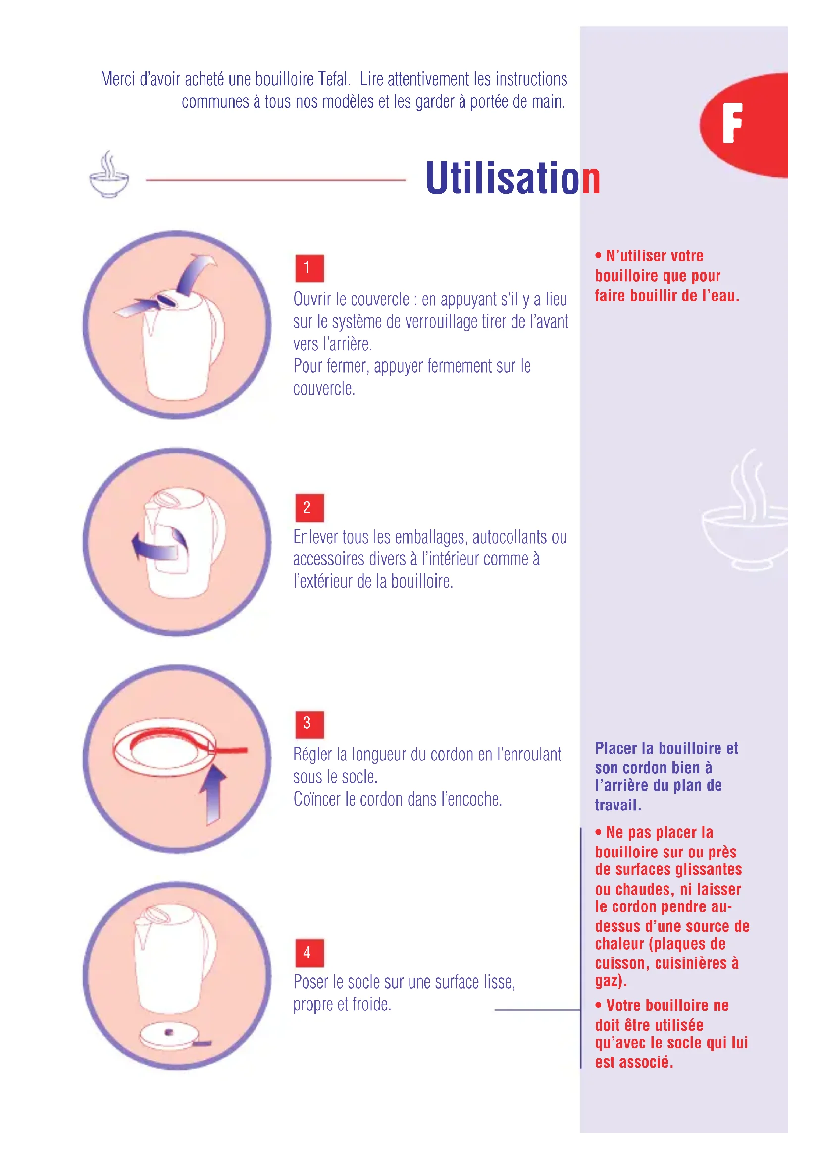 - N’utiliser votre bouilloire que pour faire bouillir de l’eau. Utilisation Merci d’avoir acheté une bouilloire Tefal. Lire attentivement les instructions communes à tous nos modèles et les garder à portée de main. FJeter l’eau des deux/trois premières utilisations car elle pourrait contenir des poussières. Rincer la bouilloire et le filtre séparément. Vous pouvez remplir par le bec, ce qui assure un meilleur entretien du filtre. Au minimum, couvrir d’eau la résistance (ou le fond de la bouilloire).