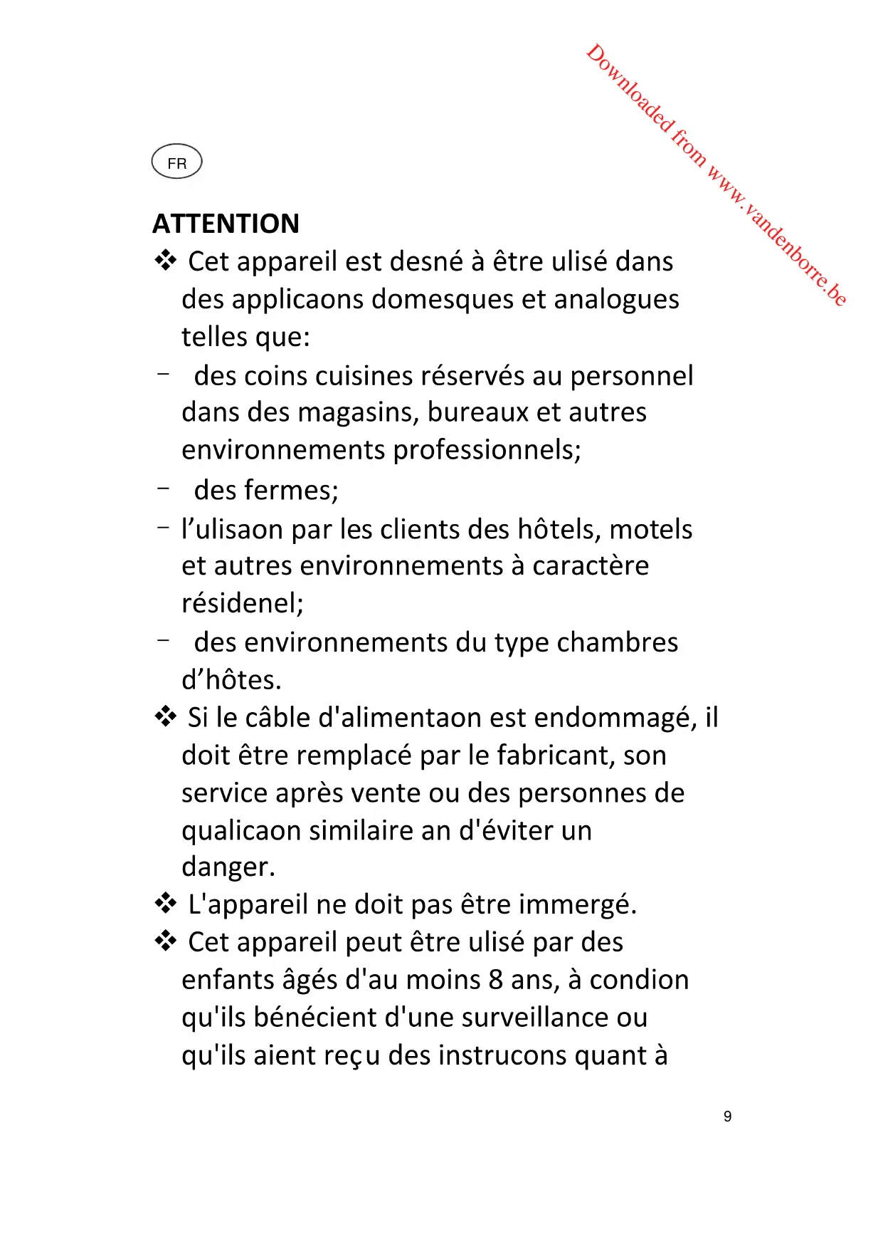 Downloaded from www.vandenborre.be10 l'utilisation de l'appareil en toute sécurité et qu'ils comprennent bien les dangers encourus. Le nettoyage et l'entretien par l'utilisateur ne doivent pas être effectués par des enfants, à moins qu'ils ne soient âgés de plus de 8 ans et qu'ils soient sous la surveillance d'un adulte. Conserver l'appareil et son câble hors de portée des enfants âgés de moins de 8 ans. Cet appareil peut être utilisé par des personnes dont les capacités physiques, sensorielles ou mentales sont réduites ou dont l'expérience ou les connaissances ne sont pas suffisantes, à condition qu'ils bénéficient d'une surveillance ou qu'ils aient reçu des instructions quant à l'utilisation de l'appareil en toute sécurité et en comprennent bien les dangers potentiels. Les enfants ne doivent pas utiliser l'appareil comme un jouet. Les informations détaillées sur la manière de nettoyer les surfaces en contact avec les aliments et du détartrage sont définis en page 15 dans la section “NETTOYAGE Downloaded from www.vandenborre.be11 ET DETARTRAGE”. MISE EN GARDE: Risques de blessures en cas de mauvaise utilisation du produit. La surface de l'élément chauffant présente une chaleur résiduelle après utilisation.