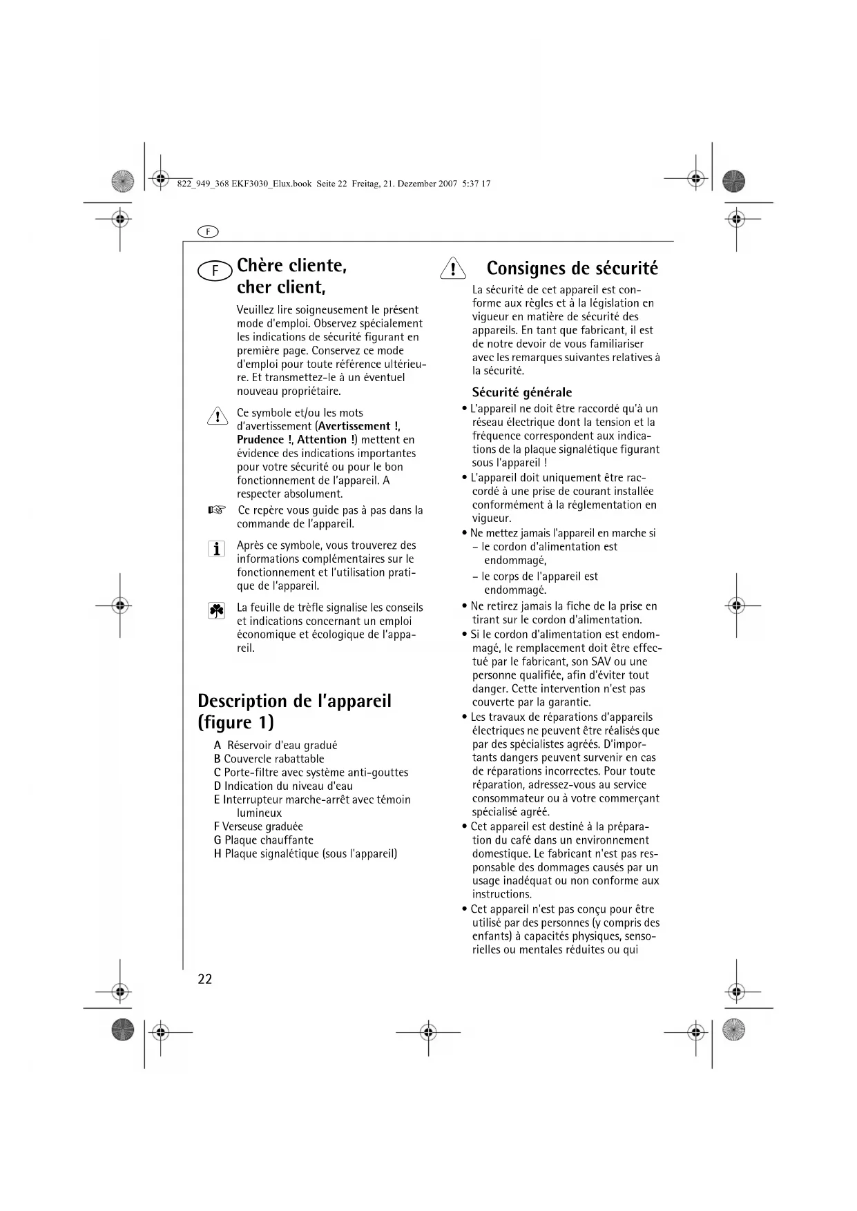 Chère cliente, cher client, Veuillez lire soigneusement le présent mode d'emploi. Observez spécialement les indications de sécurité figurant en première page. Conservez ce mode d'emploi pour toute référence ultérieu-re. Et transmettez-le à un éventuel nouveau propriétaire. Ce symbole et/ou les mots d’avertissement (Avertissement !, Prudence !, Attention !) mettent en évidence des indications importantes pour votre sécurité ou pour le bon fonctionnement de l’appareil. A respecter absolument.0 Ce repère vous guide pas à pas dans la commande de l’appareil. Après ce symbole, vous trouverez des informations complémentaires sur le fonctionnement et l’utilisation prati-que de l’appareil. La feuille de trèfle signalise les conseils et indications concernant un emploi économique et écologique de l’appa-reil. Description de l’appareil (figure 1) A Réservoir d'eau graduéB Couvercle rabattableC Porte-filtre avec système anti-gouttes D Indication du niveau d'eau E Interrupteur marche-arrêt avec témoin lumineux F Verseuse graduéeG Plaque chauffanteH Plaque signalétique (sous l'appareil) 1 Consignes de sécurité La sécurité de cet appareil est con-forme aux règles et à la législation en vigueur en matière de sécurité des appareils. En tant que fabricant, il est de notre devoir de vous familiariser avec les remarques suivantes relatives à la sécurité. Sécurité générale• L'appareil ne doit être raccordé qu'à un réseau électrique dont la tension et la fréquence correspondent aux indica-tions de la plaque signalétique figurant sous l'appareil !• L'appareil doit uniquement être rac-cordé à une prise de courant installée conformément à la réglementation en vigueur.• Ne mettez jamais l'appareil en marche si– le cordon d'alimentation est endommagé,– le corps de l'appareil est endommagé.• Ne retirez jamais la fiche de la prise en tirant sur le cordon d'alimentation.• Si le cordon d'alimentation est endom-magé, le remplacement doit être effec-tué par le fabricant, son SAV ou une personne qualifiée, afin d’éviter tout danger. Cette intervention n'est pas couverte par la garantie.• Les travaux de réparations d’appareils électriques ne peuvent être réalisés que par des spécialistes agréés. D’impor-tants dangers peuvent survenir en cas de réparations incorrectes. Pour toute réparation, adressez-vous au service consommateur ou à votre commerçant spécialisé agréé.• Cet appareil est destiné à la prépara-tion du café dans un environnement domestique. Le fabricant n'est pas res-ponsable des dommages causés par un usage inadéquat ou non conforme aux instructions.• Cet appareil n'est pas conçu pour être utilisé par des personnes (y compris des enfants) à capacités physiques, senso-rielles ou mentales réduites ou qui 822_949_368 EKF3030_Elux.book Seite 22 Freitag, 21. Dezember 2007 5:37 17f