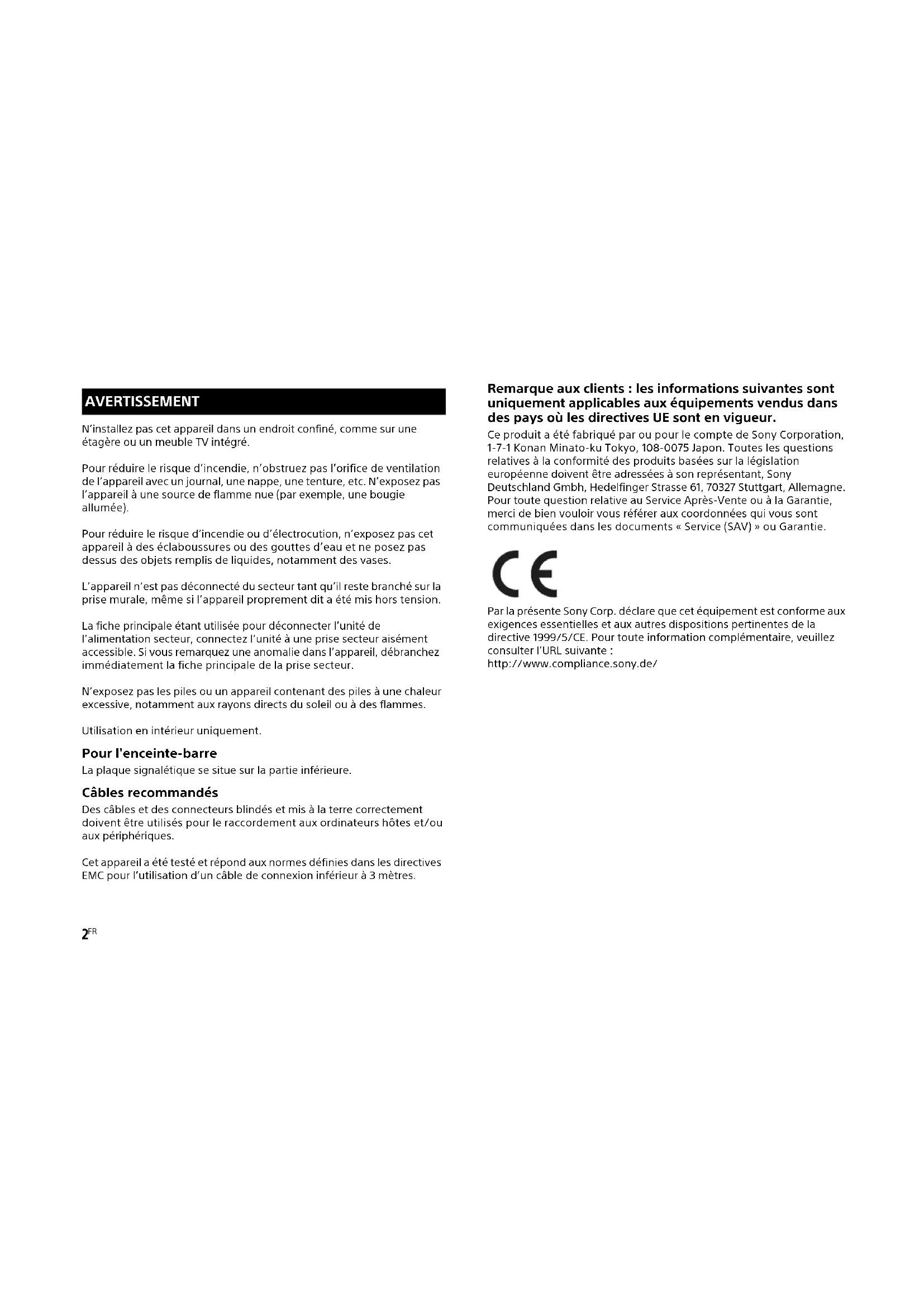 N’installez pas cet appareil dans un endroit confiné, comme sur une étagère ou un meuble TV intégré. Pour réduire le risque d’incendie, n’obstruez pas l’orifice de ventilation de l’appareil avec un journal, une nappe, une tenture, etc. N’exposez pas l’appareil à une source de flamme nue (par exemple, une bougie allumée). Pour réduire le risque d’incendie ou d’électrocution, n’exposez pas cet appareil à des éclaboussures ou des gouttes d’eau et ne posez pas dessus des objets remplis de liquides, notamment des vases. L’appareil n’est pas déconnecté du secteur tant qu’il reste branché sur la prise murale, même si l’appareil proprement dit a été mis hors tension. La fiche principale étant utilisée pour déconnecter l’unité de l’alimentation secteur, connectez l’unité à une prise secteur aisément accessible. Si vous remarquez une anomalie dans l’appareil, débranchez immédiatement la fiche principale de la prise secteur. N’exposez pas les piles ou un appareil contenant des piles à une chaleur excessive, notamment aux rayons directs du soleil ou à des flammes. Utilisation en intérieur uniquement. Pour l'enceinte-barre La plaque signalétique se situe sur la partie inférieure. Câbles recommandés Des câbles et des connecteurs blindés et mis à la terre correctement doivent être utilisés pour le raccordement aux ordinateurs hôtes et/ou aux périphériques. Cet appareil a été testé et répond aux normes définies dans les directives EMC pour l’utilisation d’un câble de connexion inférieur à 3 mètres. Remarque aux clients : les informations suivantes sont uniquement applicables aux équipements vendus dans des pays où les directives UE sont en vigueur. Ce produit a été fabriqué par ou pour le compte de Sony Corporation, 1-7-1 Konan Minato-ku Tokyo, 108-0075 Japon. Toutes les questions relatives à la conformité des produits basées sur la législation européenne doivent être adressées à son représentant, Sony Deutschland Gmbh, Hedelfinger Strasse 61, 70327 Stuttgart, Allemagne. Pour toute question relative au Service Après-Vente ou à la Garantie, merci de bien vouloir vous référer aux coordonnées qui vous sont communiquées dans les documents « Service (SAV) » ou Garantie. Par la présente Sony Corp. déclare que cet équipement est conforme aux exigences essentielles et aux autres dispositions pertinentes de la directive 1999/5/CE. Pour toute information complémentaire, veuillez consulter l’URL suivante : http://www.compliance.sony.de/ AVERTISSEMENT3