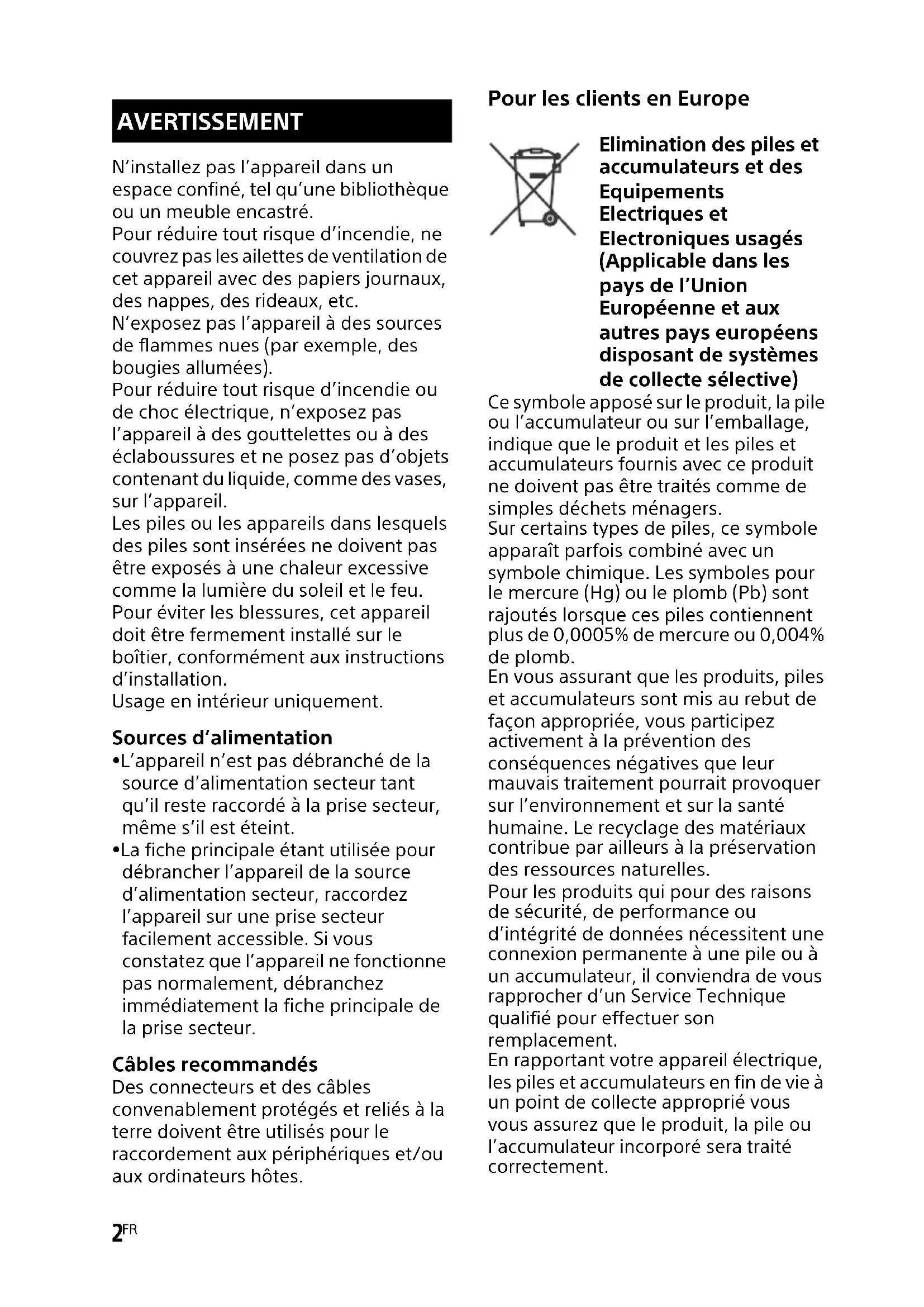 HT-XT3 4-558-561-23(1) D:\NORM'S JOB\SONY HA\SO160014\HT-XT3 (PMRF 04)\4558561231_FRESDE (CEK)\FR\020REG.fm masterpage: Gauche N’installez pas l’appareil dans un espace confiné, tel qu’une bibliothèque ou un meuble encastré. Pour réduire tout risque d’incendie, ne couvrez pas les ailettes de ventilation de cet appareil avec des papiers journaux, des nappes, des rideaux, etc. N’exposez pas l’appareil à des sources de flammes nues (par exemple, des bougies allumées). Pour réduire tout risque d’incendie ou de choc électrique, n’exposez pas l’appareil à des gouttelettes ou à des éclaboussures et ne posez pas d’objets contenant du liquide, comme des vases, sur l’appareil. Les piles ou les appareils dans lesquels des piles sont insérées ne doivent pas être exposés à une chaleur excessive comme la lumière du soleil et le feu. Pour éviter les blessures, cet appareil doit être fermement installé sur le boîtier, conformément aux instructions d’installation. Usage en intérieur uniquement. Sources d’alimentation L’appareil n’est pas débranché de la source d’alimentation secteur tant qu’il reste raccordé à la prise secteur, même s’il est éteint. La fiche principale étant utilisée pour débrancher l’appareil de la source d’alimentation secteur, raccordez l’appareil sur une prise secteur facilement accessible. Si vous constatez que l’appareil ne fonctionne pas normalement, débranchez immédiatement la fiche principale de la prise secteur. Câbles recommandés Des connecteurs et des câbles convenablement protégés et reliés à la terre doivent être utilisés pour le raccordement aux périphériques et/ou aux ordinateurs hôtes. Pour les clients en Europe Elimination des piles et accumulateurs et des Equipements Electriques et Electroniques usagés (Applicable dans les pays de l’Union Européenne et aux autres pays européens disposant de systèmes de collecte sélective) Ce symbole apposé sur le produit, la pile ou l’accumulateur ou sur l’emballage, indique que le produit et les piles et accumulateurs fournis avec ce produit ne doivent pas être traités comme de simples déchets ménagers. Sur certains types de piles, ce symbole apparaît parfois combiné avec un symbole chimique. Les symboles pour le mercure (Hg) ou le plomb (Pb) sont rajoutés lorsque ces piles contiennent plus de 0,0005% de mercure ou 0,004% de plomb. En vous assurant que les produits, piles et accumulateurs sont mis au rebut de façon appropriée, vous participez activement à la prévention des conséquences négatives que leur mauvais traitement pourrait provoquer sur l’environnement et sur la santé humaine. Le recyclage des matériaux contribue par ailleurs à la préservation des ressources naturelles. Pour les produits qui pour des raisons de sécurité, de performance ou d’intégrité de données nécessitent une connexion permanente à une pile ou à un accumulateur, il conviendra de vous rapprocher d’un Service Technique qualifié pour effectuer son remplacement. En rapportant votre appareil électrique, les piles et accumulateurs en fin de vie à un point de collecte approprié vous vous assurez que le produit, la pile ou l’accumulateur incorporé sera traité correctement. AVERTISSEMENTD:\NORM'S JOB\SONY HA\SO160014\HT-XT3 (PMRF 04)\4558561231_FRESDE (CEK)\FR\020REG.fm masterpage: Droite