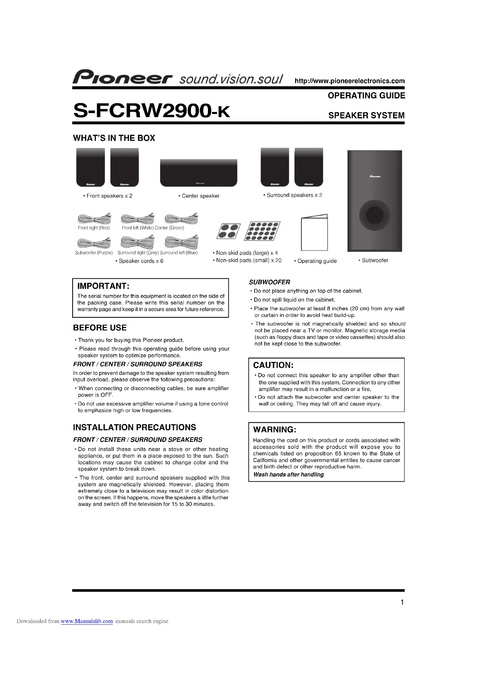 MODE D’EMPLOI ENCEINTES ACOUSTIQUES S-FCRW2900-K IMPORTANT : Le numéro de série de cet appareil est situé sur le côté ducarton d’emballage. Notez ce numéro sur la page de garantieet conservez cette dernière dans un endroit sûr pour le casoù vous en auriez besoin ultérieurement. AVANT LA MISE EN SERVICE • Merci de votre achat de cet appareil Pioneer. • Veuillez lire attentivement ce mode d’emploi avant d’utiliserces enceintes acoustiques, afin d’en obtenir des performancesoptimales.HAUT-PARLEURS AVANT / CENTRAL / AMBIANCEPour éviter aux enceintes acoustiques des dégâts causés parune surcharge à l’entrée, respectez les précautions suivantes : • Avant de brancher ou de débrancher les câbles, assurez-vousque l’amplificateur est hors tension (OFF). • N’élevez pas excessivement le volume si vous utilisez unecommande des tonalités pour accentuer les hautes ou lesbasses fréquences. PRÉCAUTIONS À L’INSTALLATION HAUT-PARLEURS AVANT / CENTRAL / AMBIANCE • N’installez pas ces appareils près d’un feu ou d’un appareilde chauffage et ne les placez pas en plein soleil. De telsendroits pourraient décolorer le coffret ou provoquer une pannedes haut-parleurs. • Les haut-parleurs avant, central et d’ambiance fournis avecce système sont blindés magnétiquement. Toutefois, s’ils sontplacés trop près d’un téléviseur, une distorsion des couleurspeut se produire sur l’écran. Dans ce cas, écartez davantageles haut-parleurs et mettez le téléviseur hors tension pendant15 à 30 minutes.CAISSON DE BASSE • Ne posez rien sur le dessus du coffret. • Ne renversez aucun liquide sur le coffret. • Posez le caisson de basse à au-moins 20 cm de tout mur ourideau afin d’éviter un échauffement interne. • Comme le caisson de basse n’est pas blindé magnétiquement,ne le placez pas à proximité d’un téléviseur ou d’un moniteur.En plus, tout support magnétique de données (tels quedisquettes, bandes ou cassettes vidéo) doit être placé loin ducaisson de basses. ATTENTION : • Ne reliez pas cette enceinte à un amplificateur autre quecelui qui est fourni avec le système. Cela pourraitprovoquer un dysfonctionnement ou un incendie.• Ne fixez ni le caisson de basses ni l’enceinte centrale aumur ou au plafond. Ils risqueraient, en tombant, de blesserquelqu’un. http://www.pioneerelectronics.ca