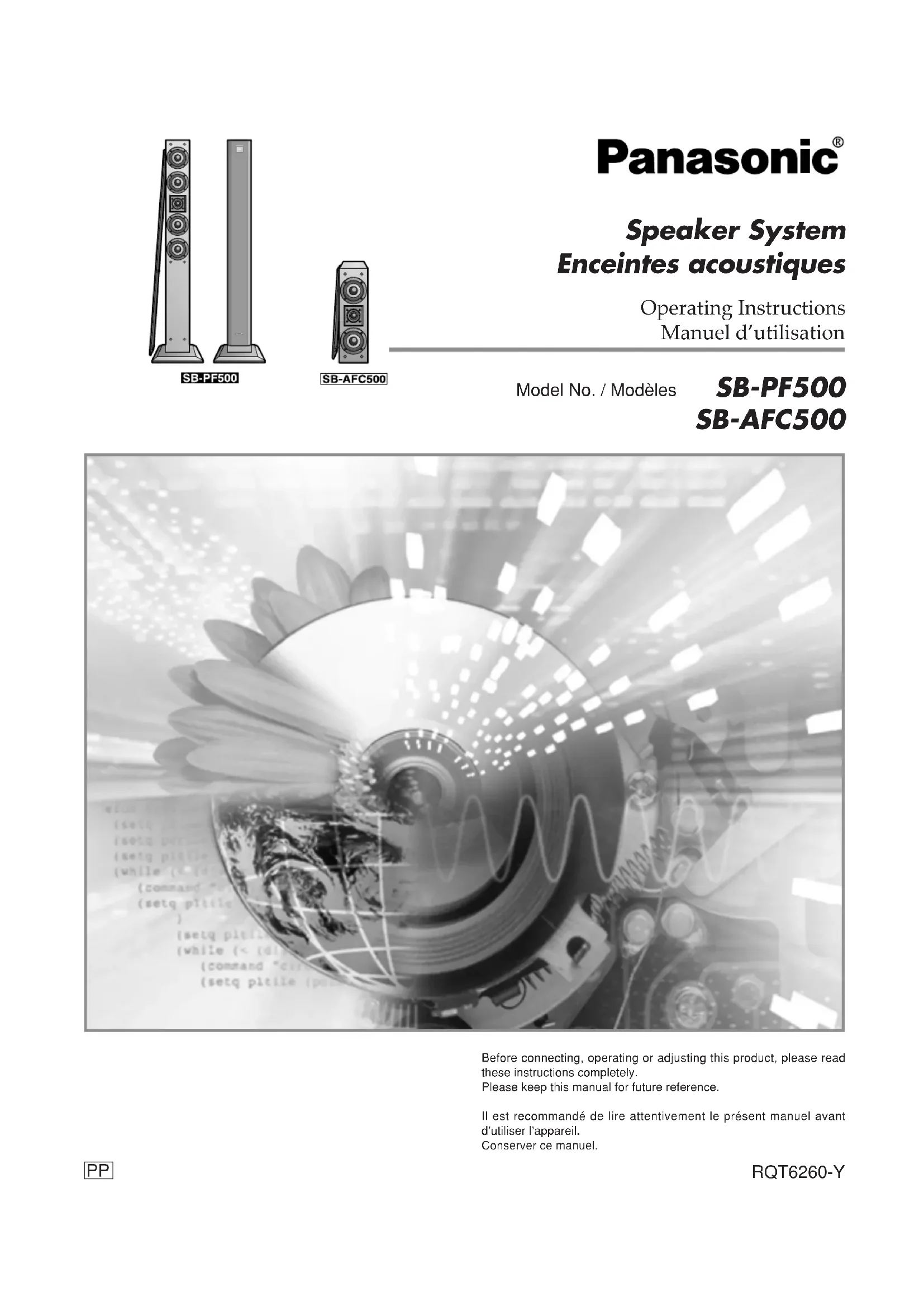 NUMÉRO DE MODÈLE SB-PF500 / SB-AFC500NUMÉRO DE SÉRIE Care These speakers have sharp edges and corners.Take care when moving them.Locate them so that they will not be knocked.The speaker's edges and corners can cause injury if youknock them or the speaker falls over. Précaution Ces enceintes ont des coins et des arêtes vifs.Les déplacer avec soin.Comme les arêtes et les coins des enceintes peuvent causer des blessures si elles sont basculées ou renversées, il est recommandé de les placer dans des endroits sécuritaires.RQT6260