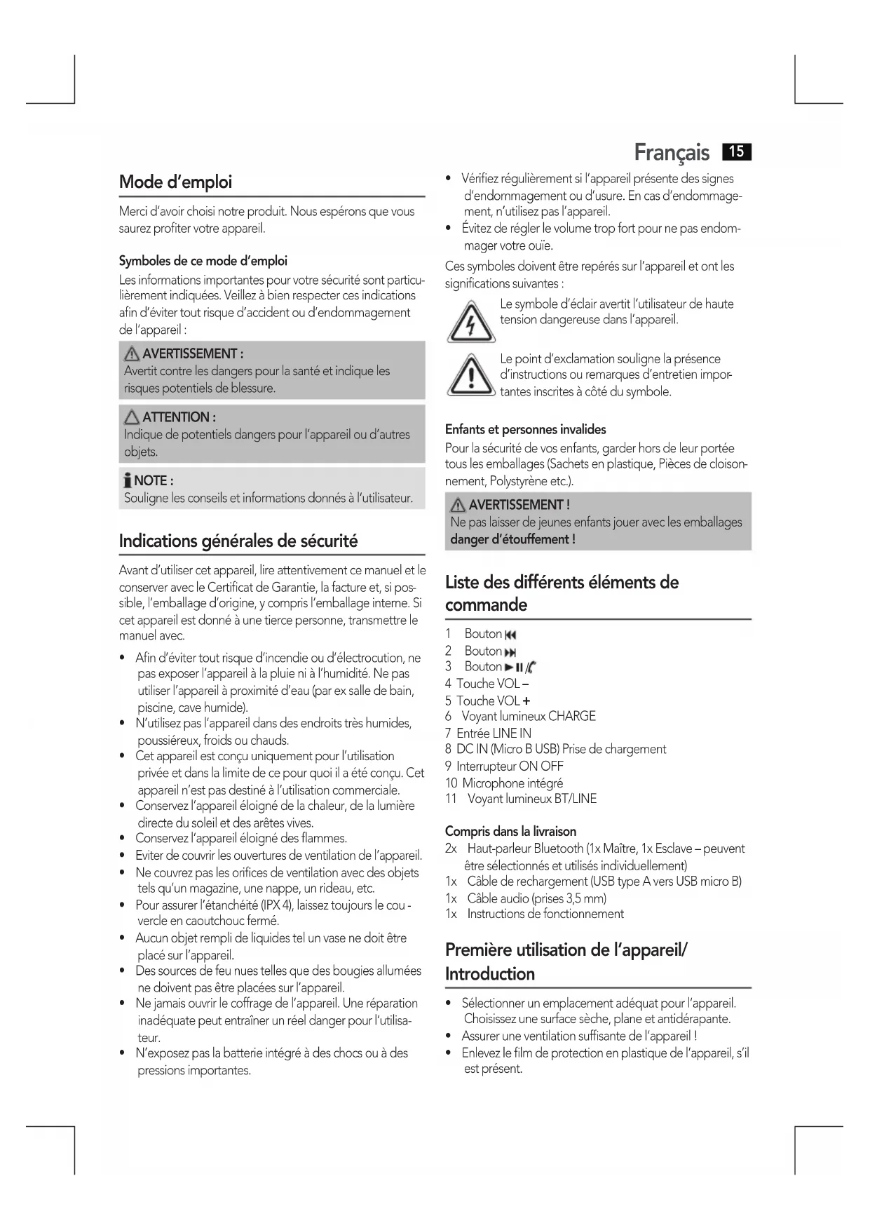 4 Touche VOL – 5 Touche VOL + 6 VoyantlumineuxCHARGE 7 Entrée LINE IN 8 DC IN (Micro B USB) Prise de chargement 9 Interrupteur ON OFF 10 Microphone intégré 11 VoyantlumineuxBT/LINE Compris dans la livraison 2x Haut-parleurBluetooth(1xMaître,1xEsclave–peuvent être sélectionnés et utilisés individuellement) 1x Câblederechargement(USBtypeAversUSBmicroB) 1x Câbleaudio(prises3,5mm) 1x Instructionsdefonctionnement Première utilisation de l’appareil/ Introduction