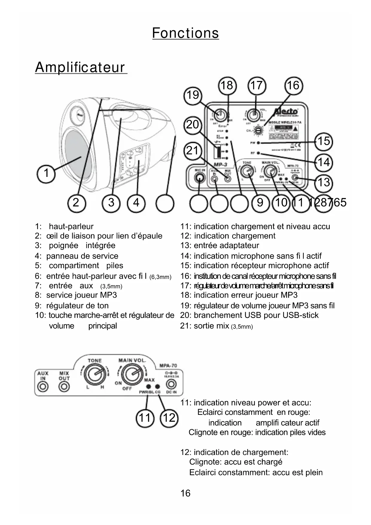 Fonctions Amplificateur 1: haut-parleur 2: œil de liaison pour lien d’épaule 3: poignée intégrée 4: panneau de service 5: compartiment piles 6: entrée haut-parleur avec fi l (6,3mm) 7: entrée aux (3,5mm) 8: service joueur MP3 9: régulateur de ton 10: touche marche-arrêt et régulateur de volume principal 11: indication chargement et niveau accu 12: indication chargement 13: entrée adaptateur 14: indication microphone sans fi l actif 15: indication récepteur microphone actif 16: institution de canal récepteur microphone sans fil 17: régulateur de volume marche/arrêt microphone sans fil 18: indication erreur joueur MP3 19: régulateur de volume joueur MP3 sans fi l 20: branchement USB pour USB-stick 21: sortie mix (3,5mm)