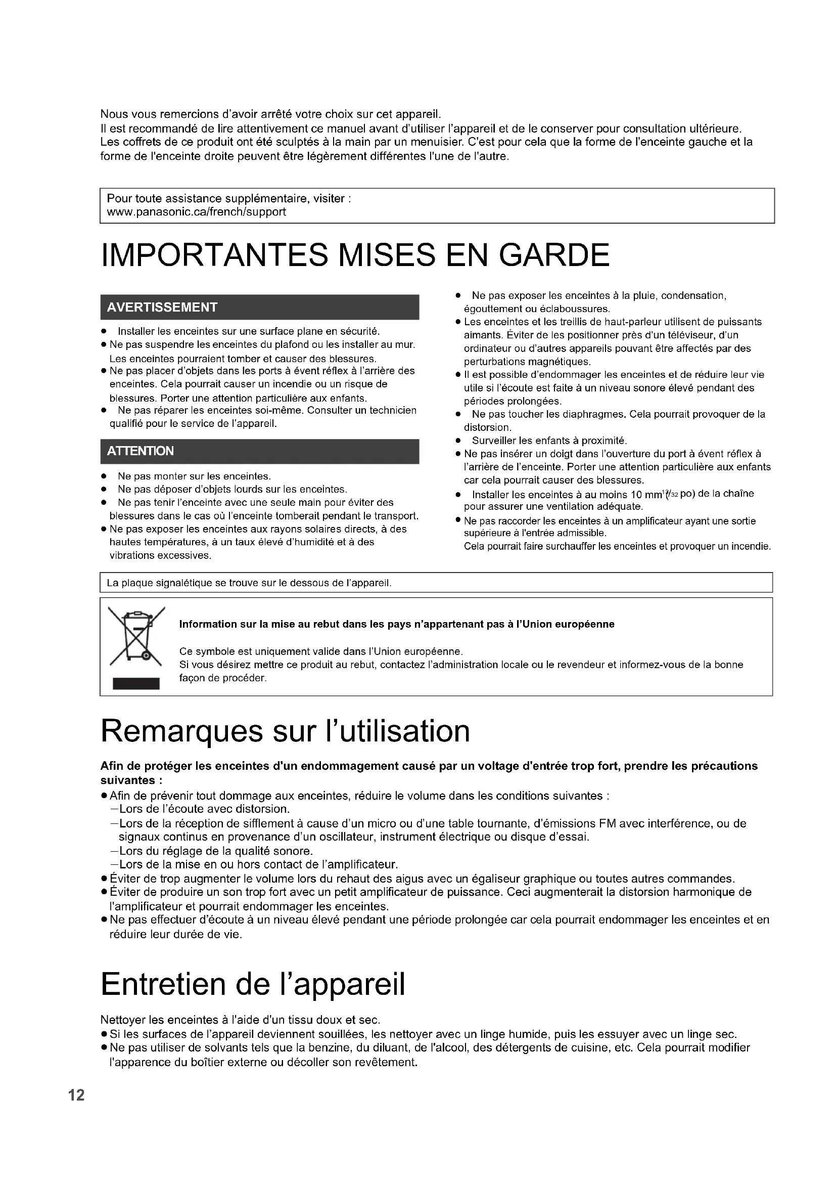 Ne pas raccorder les enceintes à un amplificateur ayant une sortie supérieure à l'entrée admissible. Cela pourrait faire surchauffer les enceintes et provoquer un incendie. Remarques sur l’utilisation Afin de protéger les enceintes d'un endommagement causé par un voltage d'entrée trop fort, prendre les précautions suivantes : ≥Afin de prévenir tout dommage aux enceintes, réduire le volume dans les conditions suivantes : jLors de l’écoute avec distorsion. jLors de la réception de sifflement à cause d’un micro ou d’une table tournante, d’émissions FM avec interférence, ou de signaux continus en provenance d’un oscillateur, instrument électrique ou disque d’essai. jLors du réglage de la qualité sonore. jLors de la mise en ou hors contact de l’amplificateur. ≥Éviter de trop augmenter le volume lors du rehaut des aigus avec un égaliseur graphique ou toutes autres commandes. ≥Éviter de produire un son trop fort avec un petit amplificateur de puissance. Ceci augmenterait la distorsion harmonique de l'amplificateur et pourrait endommager les enceintes. ≥Ne pas effectuer d’écoute à un niveau élevé pendant une période prolongée car cela pourrait endommager les enceintes et en réduire leur durée de vie. Entretien de l’appareil Nettoyer les enceintes à l'aide d'un tissu doux et sec. ≥Si les surfaces de l’appareil deviennent souillées, les nettoyer avec un linge humide, puis les essuyer avec un linge sec. ≥Ne pas utiliser de solvants tels que la benzine, du diluant, de l'alcool, des détergents de cuisine, etc. Cela pourrait modifier l'apparence du boîtier externe ou décoller son revêtement. Pour toute assistance supplémentaire, visiter : www.panasonic.ca/french/support AVERTISSEMENT ATTENTION La plaque signalétique se trouve sur le dessous de l’appareil. Information sur la mise au rebut dans les pays n’appartenant pas à l’Union européenne Ce symbole est uniquement valide dans l’Union européenne. Si vous désirez mettre ce produit au rebut, contactez l’administration locale ou le revendeur et informez-vous de la bonne façon de procéder. SB-C700-SQT0648_PPCEBEGGN_mst.book 12 ページ 2015年6月16日 火曜日 午後3時35分13 Français (Canada) Table des matières Accessoires