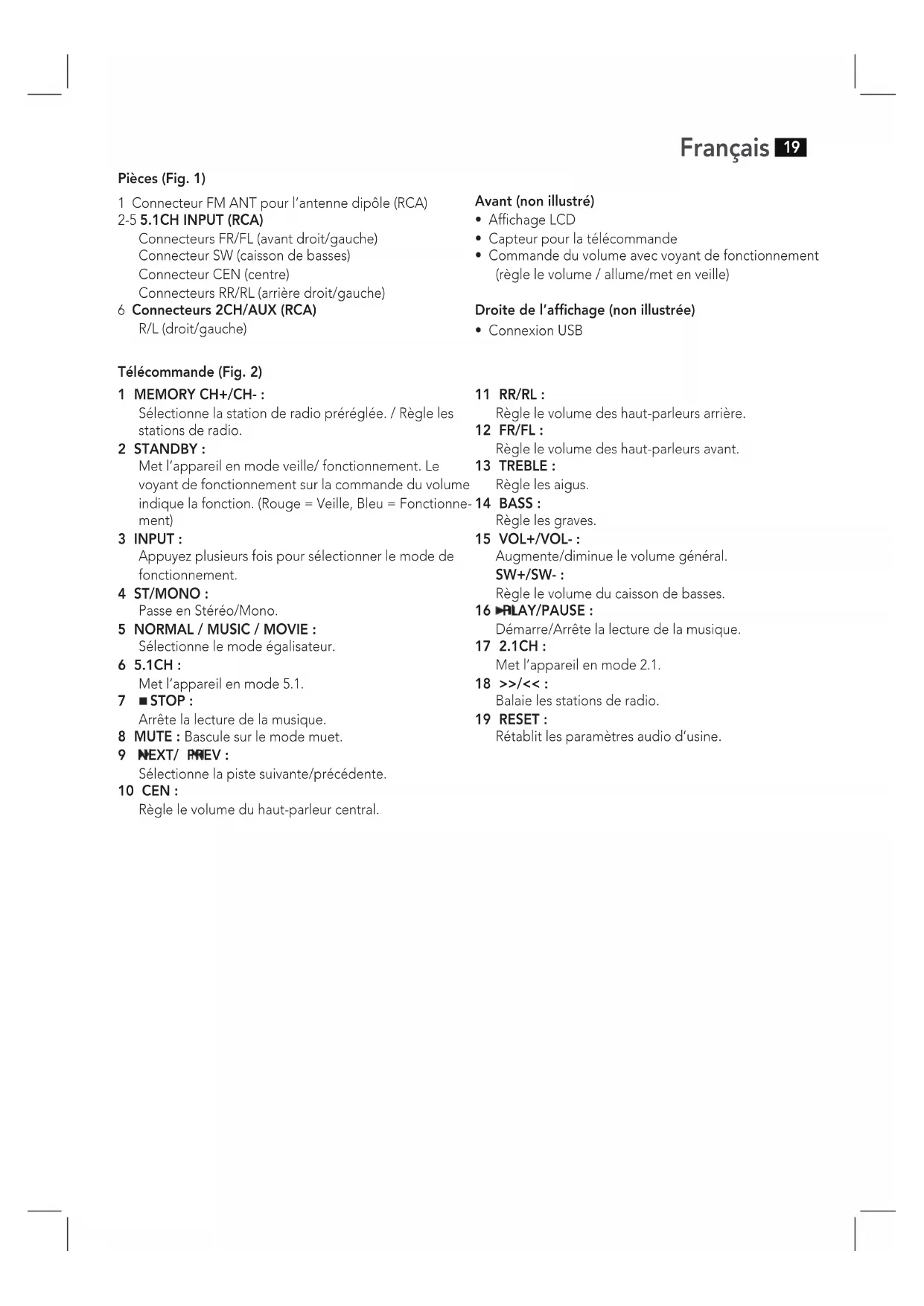 Pièces (Fig. 1) 1 Connecteur FM ANT pour l’antenne dipôle (RCA) 2-5 5.1CH INPUT (RCA) Connecteurs FR/FL (avant droit/gauche) Connecteur SW (caisson de basses) Connecteur CEN (centre) Connecteurs RR/RL (arrière droit/gauche) 6 Connecteurs 2CH/AUX (RCA) R/L (droit/gauche) Avant (non illustré)