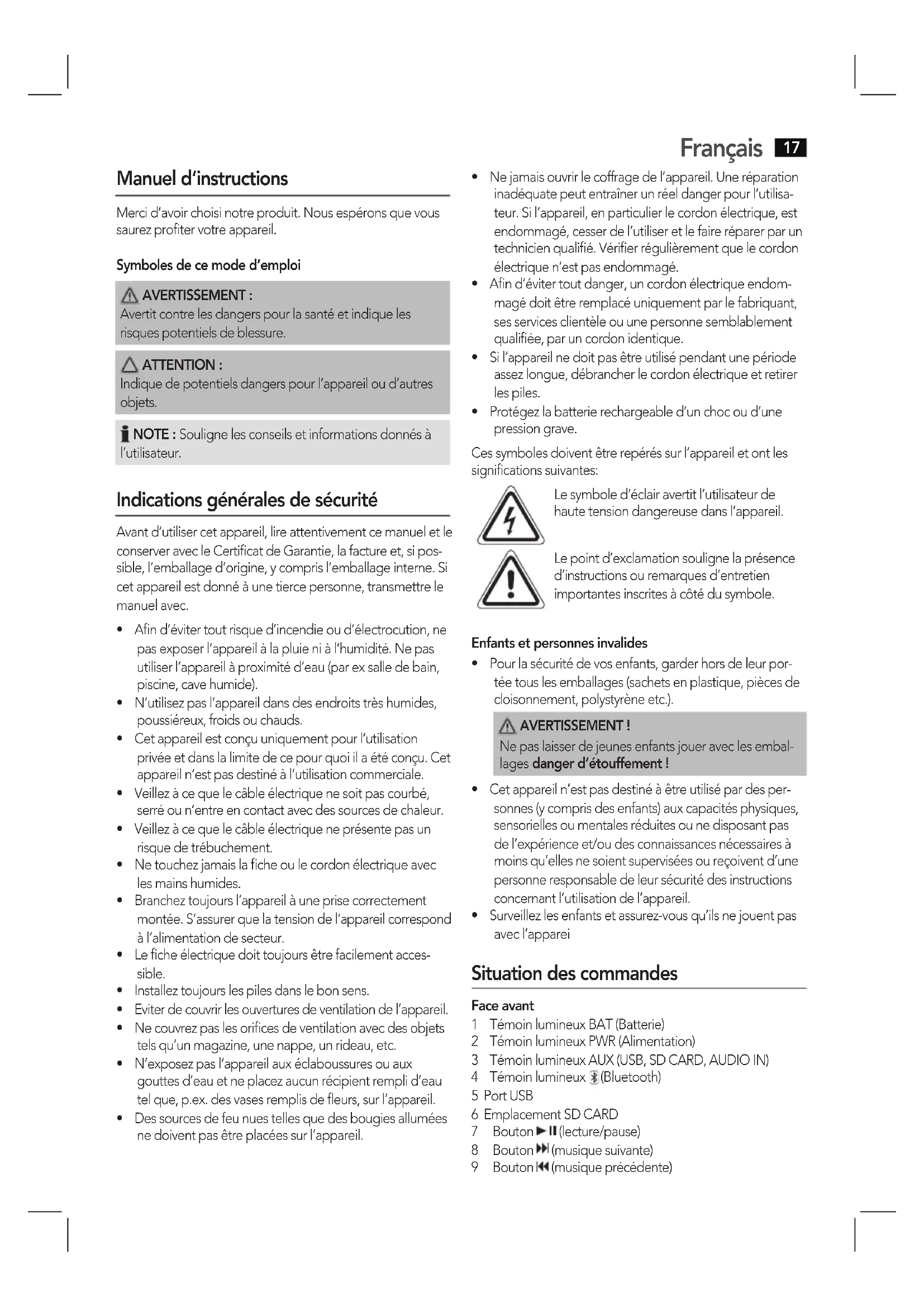 - Surveillezlesenfantsetassurez-vousqu’ilsnejouentpas avec l’apparei Situation des commandes Face avant 1 TémoinlumineuxBAT(Batterie) 2 TémoinlumineuxPWR(Alimentation) 3 TémoinlumineuxAUX(USB,SDCARD,AUDIOIN) 4 Témoinlumineux (Bluetooth) 5 Port USB 6 Emplacement SD CARD 7 Bouton (lecture/pause) 8 Bouton (musique suivante) 9 Bouton (musique précédente)Français