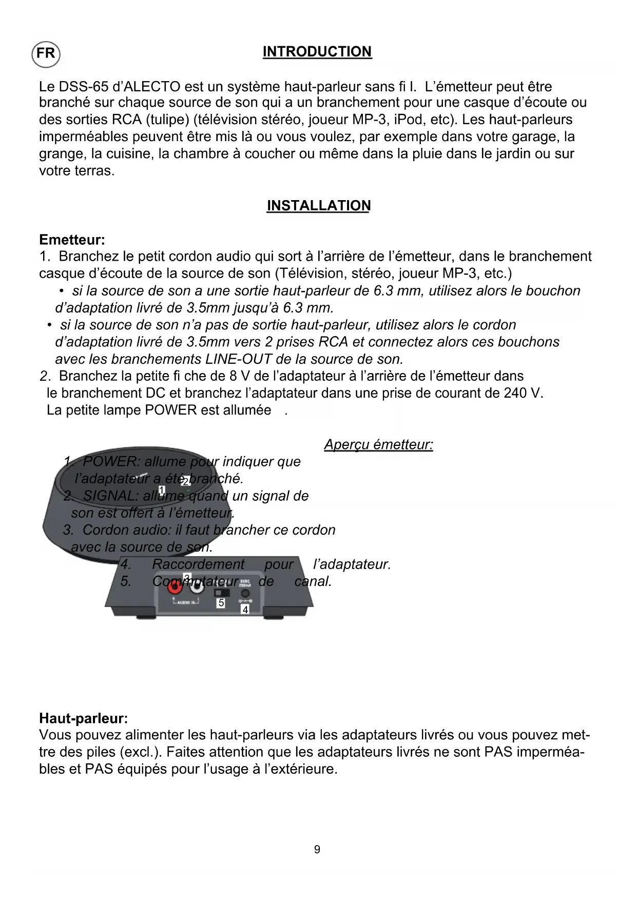 Haut-parleur: Vous pouvez alimenter les haut-parleurs via les adaptateurs livrés ou vous pouvez met- tre des piles (excl.). Faites attention que les adaptateurs livrés ne sont PAS imperméa- bles et PAS équipés pour l’usage à l’extérieure.