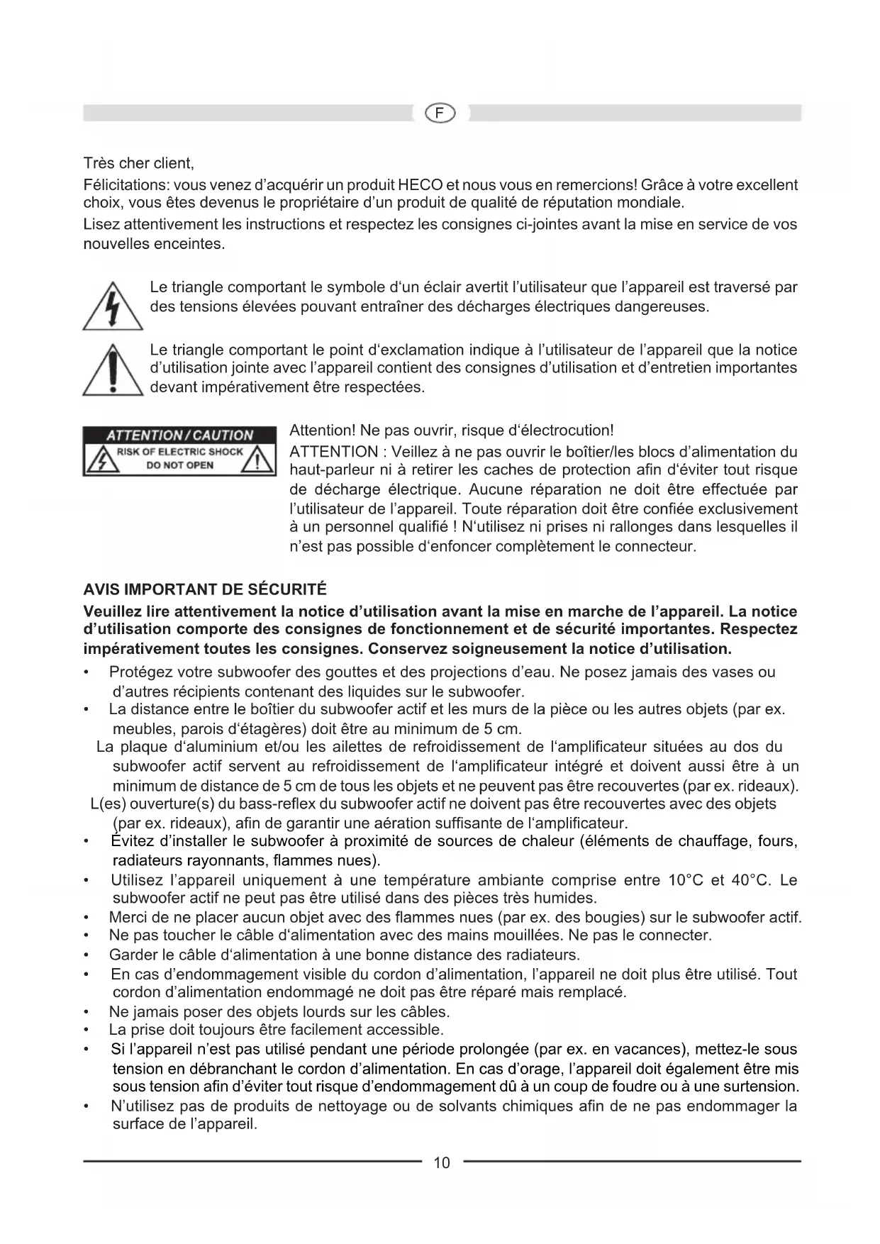 Très cher client, Félicitations: vous venez d’acquérir un produit HECO et nous vous en remercions! Grâce à votre excellent choix, vous êtes devenus le propriétaire d’un produit de qualité de réputation mondiale. Lisez attentivement les instructions et respectez les consignes ci-jointes avant la mise en service de vos nouvelles enceintes. Le triangle comportant le symbole d‘un éclair avertit l’utilisateur que l’appareil est traversé par des tensions élevées pouvant entraîner des décharges électriques dangereuses. Le triangle comportant le point d‘exclamation indique à l’utilisateur de l’appareil que la notice d’utilisation jointe avec l’appareil contient des consignes d’utilisation et d’entretien importantes devant impérativement être respectées. Attention! Ne pas ouvrir, risque d‘électrocution! ATTENTION : Veillez à ne pas ouvrir le boîtier/les blocs d’alimentation du haut-parleur ni à retirer les caches de protection afin d‘éviter tout risque de décharge électrique. Aucune réparation ne doit être effectuée par l’utilisateur de l’appareil. Toute réparation doit être confiée exclusivement à un personnel qualifié ! N‘utilisez ni prises ni rallonges dans lesquelles il n’est pas possible d‘enfoncer complètement le connecteur.
