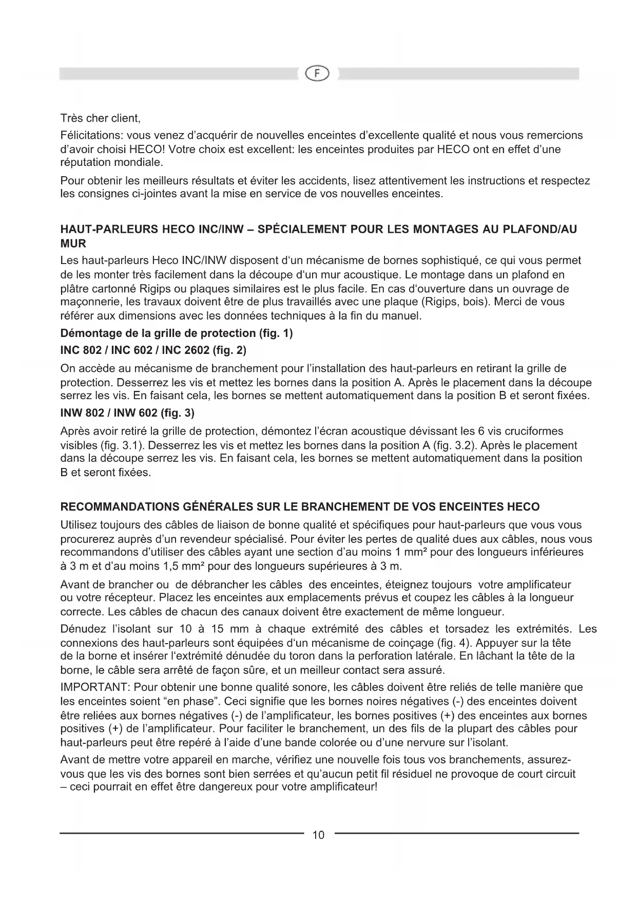 Power-handling capacity: 120 / 200 W 100 / 180 W 100 / 180 W Impedance: 4 – 8 ohms 4 – 8 ohms 2 x 4 ohms Crossover frequency: 3,500 Hz 3,500 Hz 3,600 Hz Frequency response: 32 – 32,000 Hz 35 – 32,000 Hz 35 – 30,000 Hz Recommended amplifier output: 30 – 180 W 30 – 140 W 30 – 140 W Efficiency (1W/1m): 91 dB 90 dB 90 dB External dimensions Ø: 272 mm 231 mm 231 mm Hole cut-out Ø: 242 mm 198 mm 198 mm Mounting depth: 112 mm 98 mm 92 mm INW 802 INW 602 Power-handling capacity: 120 / 200 W 100 / 180 W Impedance: 4 ohms 4 – 8 ohms Crossover frequency: 3,500 Hz 3,500 Hz Frequency response: 32 – 32,000 Hz 38 – 32,000 Hz Recommended amplifier output: 30 – 180 W 30 – 160 W Efficiency (1W/1m): 91 dB 90 dB External dimensions (w x h): 253 x 356 mm 219 x 306 mm Hole cut-out (w x h): 223 x 325 mm 188 x 274 mm Mounting depth: 90 mm 75 mm Subject to technical change. 9Très cher client, Félicitations: vous venez d’acquérir de nouvelles enceintes d’excellente qualité et nous vous remercions d’avoir choisi HECO! Votre choix est excellent: les enceintes produites par HECO ont en effet d’une réputation mondiale. Pour obtenir les meilleurs résultats et éviter les accidents, lisez attentivement les instructions et respectez les consignes ci-jointes avant la mise en service de vos nouvelles enceintes. HAUT-PARLEURS HECO INC/INW – SPÉCIALEMENT POUR LES MONTAGES AU PLAFOND/AU MUR Les haut-parleurs Heco INC/INW disposent d‘un mécanisme de bornes sophistiqué, ce qui vous permet de les monter très facilement dans la découpe d‘un mur acoustique. Le montage dans un plafond en plâtre cartonné Rigips ou plaques similaires est le plus facile. En cas d‘ouverture dans un ouvrage de maçonnerie, les travaux doivent être de plus travaillés avec une plaque (Rigips, bois). Merci de vous référer aux dimensions avec les données techniques à la fin du manuel. Démontage de la grille de protection (fig. 1) INC 802 / INC 602 / INC 2602 (fig. 2) On accède au mécanisme de branchement pour l’installation des haut-parleurs en retirant la grille de protection. Desserrez les vis et mettez les bornes dans la position A. Après le placement dans la découpe serrez les vis. En faisant cela, les bornes se mettent automatiquement dans la position B et seront fixées. INW 802 / INW 602 (fig. 3) Après avoir retiré la grille de protection, démontez l’écran acoustique dévissant les 6 vis cruciformes visibles (fig. 3.1). Desserrez les vis et mettez les bornes dans la position A (fig. 3.2). Après le placement dans la découpe serrez les vis. En faisant cela, les bornes se mettent automatiquement dans la position B et seront fixées. RECOMMANDATIONS GÉNÉRALES SUR LE BRANCHEMENT DE VOS ENCEINTES HECO Utilisez toujours des câbles de liaison de bonne qualité et spécifiques pour haut-parleurs que vous vous procurerez auprès d’un revendeur spécialisé. Pour éviter les pertes de qualité dues aux câbles, nous vous recommandons d’utiliser des câbles ayant une section d’au moins 1 mm² pour des longueurs inférieures à 3 m et d’au moins 1,5 mm² pour des longueurs supérieures à 3 m. Avant de brancher ou de débrancher les câbles des enceintes, éteignez toujours votre amplificateur ou votre récepteur. Placez les enceintes aux emplacements prévus et coupez les câbles à la longueur correcte. Les câbles de chacun des canaux doivent être exactement de même longueur. Dénudez l’isolant sur 10 à 15 mm à chaque extrémité des câbles et torsadez les extrémités. Les connexions des haut-parleurs sont équipées d‘un mécanisme de coinçage (fig. 4). Appuyer sur la tête de la borne et insérer l‘extrémité dénudée du toron dans la perforation latérale. En lâchant la tête de la borne, le câble sera arrêté de façon sûre, et un meilleur contact sera assuré. IMPORTANT: Pour obtenir une bonne qualité sonore, les câbles doivent être reliés de telle manière que les enceintes soient “en phase”. Ceci signifie que les bornes noires négatives (-) des enceintes doivent être reliées aux bornes négatives (-) de l’amplificateur, les bornes positives (+) des enceintes aux bornes positives (+) de l’amplificateur. Pour faciliter le branchement, un des fils de la plupart des câbles pour haut-parleurs peut être repéré à l’aide d’une bande colorée ou d’une nervure sur l’isolant. Avant de mettre votre appareil en marche, vérifiez une nouvelle fois tous vos branchements, assurez- vous que les vis des bornes sont bien serrées et qu’aucun petit fil résiduel ne provoque de court circuit – ceci pourrait en effet être dangereux pour votre amplificateur! 10ADAPTATION ACOUSTIQUE Le filtre de fréquences vous offre grâce à un commutateur de grande qualité une adaptation sonore individuelle du système de haut-parleurs: