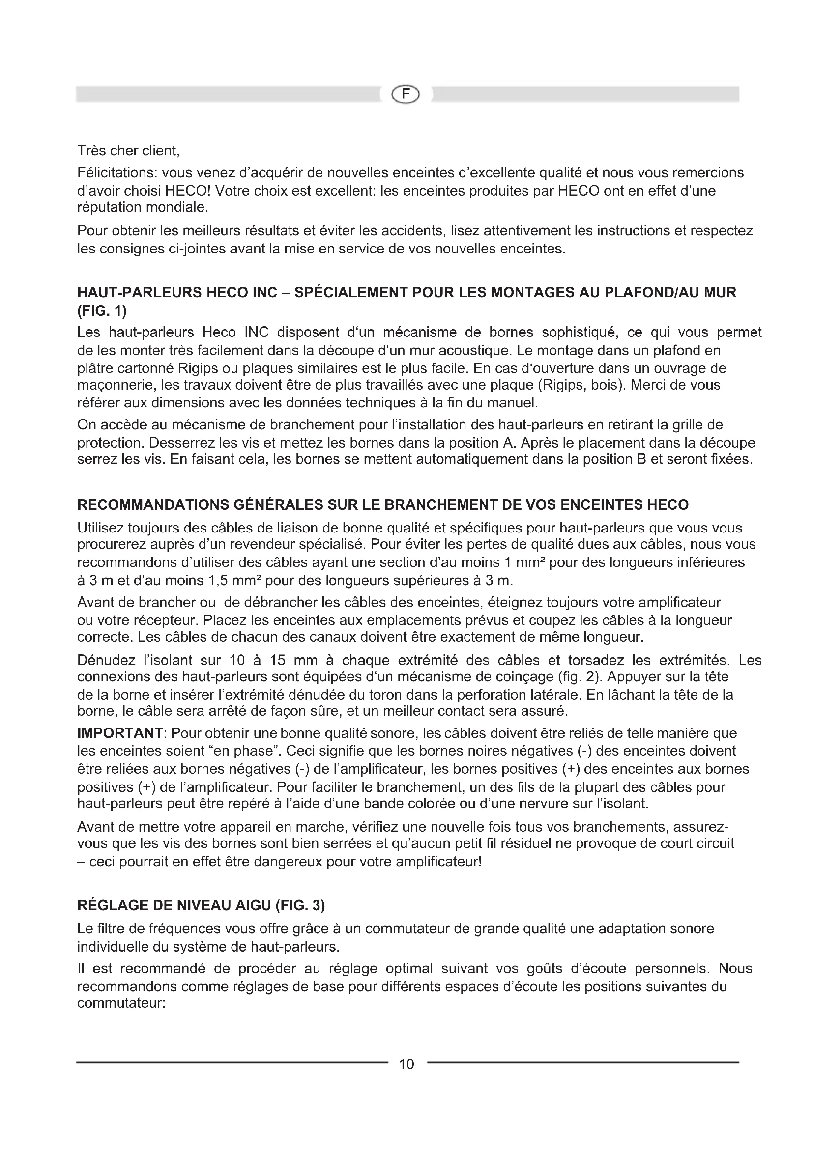 9Très cher client, Félicitations: vous venez d’acquérir de nouvelles enceintes d’excellente qualité et nous vous remercions d’avoir choisi HECO! Votre choix est excellent: les enceintes produites par HECO ont en effet d’une réputation mondiale. Pour obtenir les meilleurs résultats et éviter les accidents, lisez attentivement les instructions et respectez les consignes ci-jointes avant la mise en service de vos nouvelles enceintes. HAUT-PARLEURS HECO INC – SPÉCIALEMENT POUR LES MONTAGES AU PLAFOND/AU MUR (FIG. 1) Les haut-parleurs Heco INC disposent d‘un mécanisme de bornes sophistiqué, ce qui vous permet de les monter très facilement dans la découpe d‘un mur acoustique. Le montage dans un plafond en plâtre cartonné Rigips ou plaques similaires est le plus facile. En cas d‘ouverture dans un ouvrage de maçonnerie, les travaux doivent être de plus travaillés avec une plaque (Rigips, bois). Merci de vous référer aux dimensions avec les données techniques à la n du manuel. On accède au mécanisme de branchement pour l’installation des haut-parleurs en retirant la grille de protection. Desserrez les vis et mettez les bornes dans la position A. Après le placement dans la découpe serrez les vis. En faisant cela, les bornes se mettent automatiquement dans la position B et seront xées. RECOMMANDATIONS GÉNÉRALES SUR LE BRANCHEMENT DE VOS ENCEINTES HECO Utilisez toujours des câbles de liaison de bonne qualité et spéciques pour haut-parleurs que vous vous procurerez auprès d’un revendeur spécialisé. Pour éviter les pertes de qualité dues aux câbles, nous vous recommandons d’utiliser des câbles ayant une section d’au moins 1 mm² pour des longueurs inférieures à 3 m et d’au moins 1,5 mm² pour des longueurs supérieures à 3 m. Avant de brancher ou de débrancher les câbles des enceintes, éteignez toujours votre amplicateur ou votre récepteur. Placez les enceintes aux emplacements prévus et coupez les câbles à la longueur correcte. Les câbles de chacun des canaux doivent être exactement de même longueur. Dénudez l’isolant sur 10 à 15 mm à chaque extrémité des câbles et torsadez les extrémités. Les connexions des haut-parleurs sont équipées d‘un mécanisme de coinçage (g. 2). Appuyer sur la tête de la borne et insérer l‘extrémité dénudée du toron dans la perforation latérale. En lâchant la tête de la borne, le câble sera arrêté de façon sûre, et un meilleur contact sera assuré. IMPORTANT: Pour obtenir une bonne qualité sonore, les câbles doivent être reliés de telle manière que les enceintes soient “en phase”. Ceci signie que les bornes noires négatives (-) des enceintes doivent être reliées aux bornes négatives (-) de l’amplicateur, les bornes positives (+) des enceintes aux bornes positives (+) de l’amplicateur. Pour faciliter le branchement, un des ls de la plupart des câbles pour haut-parleurs peut être repéré à l’aide d’une bande colorée ou d’une nervure sur l’isolant. Avant de mettre votre appareil en marche, vériez une nouvelle fois tous vos branchements, assurez- vous que les vis des bornes sont bien serrées et qu’aucun petit l résiduel ne provoque de court circuit – ceci pourrait en effet être dangereux pour votre amplicateur! RÉGLAGE DE NIVEAU AIGU (FIG. 3) Le ltre de fréquences vous offre grâce à un commutateur de grande qualité une adaptation sonore individuelle du système de haut-parleurs. Il est recommandé de procéder au réglage optimal suivant vos goûts d’écoute personnels. Nous recommandons comme réglages de base pour différents espaces d’écoute les positions suivantes du commutateur: