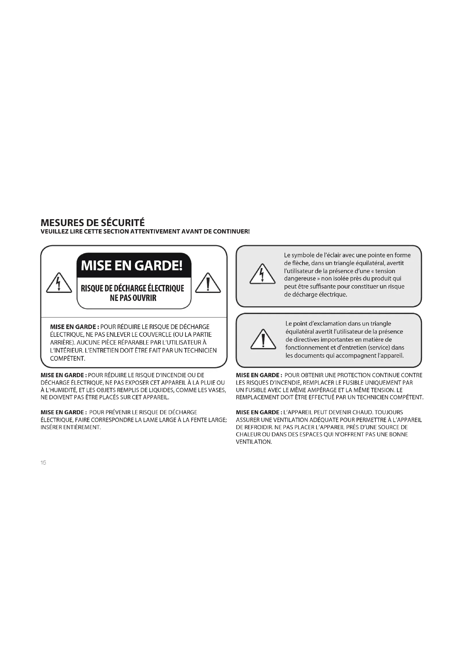 Le symbole de l’éclair avec une pointe en forme de flèche, dans un triangle équilatéral, avertit l’utilisateur de la présence d’une « tension dangereuse » non isolée près du produit qui peut être suffisante pour constituer un risque de décharge électrique. Le point d’exclamation dans un triangle équilatéral avertit l’utilisateur de la présence de directives importantes en matière de fonctionnement et d’entretien (service) dans les documents qui accompagnent l’appareil. MISE EN GARDE : POUR RÉDUIRE LE RISQUE D’INCENDIE OU DE DÉCHARGE ÉLECTRIQUE, NE PAS EXPOSER CET APPAREIL À LA PLUIE OU À L’HUMIDITÉ, ET LES OBJETS REMPLIS DE LIQUIDES, COMME LES VASES, NE DOIVENT PAS ÊTRE PLACÉS SUR CET APPAREIL. MISE EN GARDE : POUR PRÉVENIR LE RISQUE DE DÉCHARGE ÉLECTRIQUE, FAIRE CORRESPONDRE LA LAME LARGE À LA FENTE LARGE; INSÉRER ENTIÈREMENT. MISE EN GARDE : POUR OBTENIR UNE PROTECTION CONTINUE CONTRE LES RISQUES D’INCENDIE, REMPLACER LE FUSIBLE UNIQUEMENT PAR UN FUSIBLE AVEC LE MÊME AMPÉRAGE ET LA MÊME TENSION. LE REMPLACEMENT DOIT ÊTRE EFFECTUÉ PAR UN TECHNICIEN COMPÉTENT. MISE EN GARDE : L’APPAREIL PEUT DEVENIR CHAUD. TOUJOURS ASSURER UNE VENTILATION ADÉQUATE POUR PERMETTRE À L’APPAREIL DE REFROIDIR. NE PAS PLACER L’APPAREIL PRÈS D’UNE SOURCE DE CHALEUR OU DANS DES ESPACES QUI N’OFFRENT PAS UNE BONNE VENTILATION.