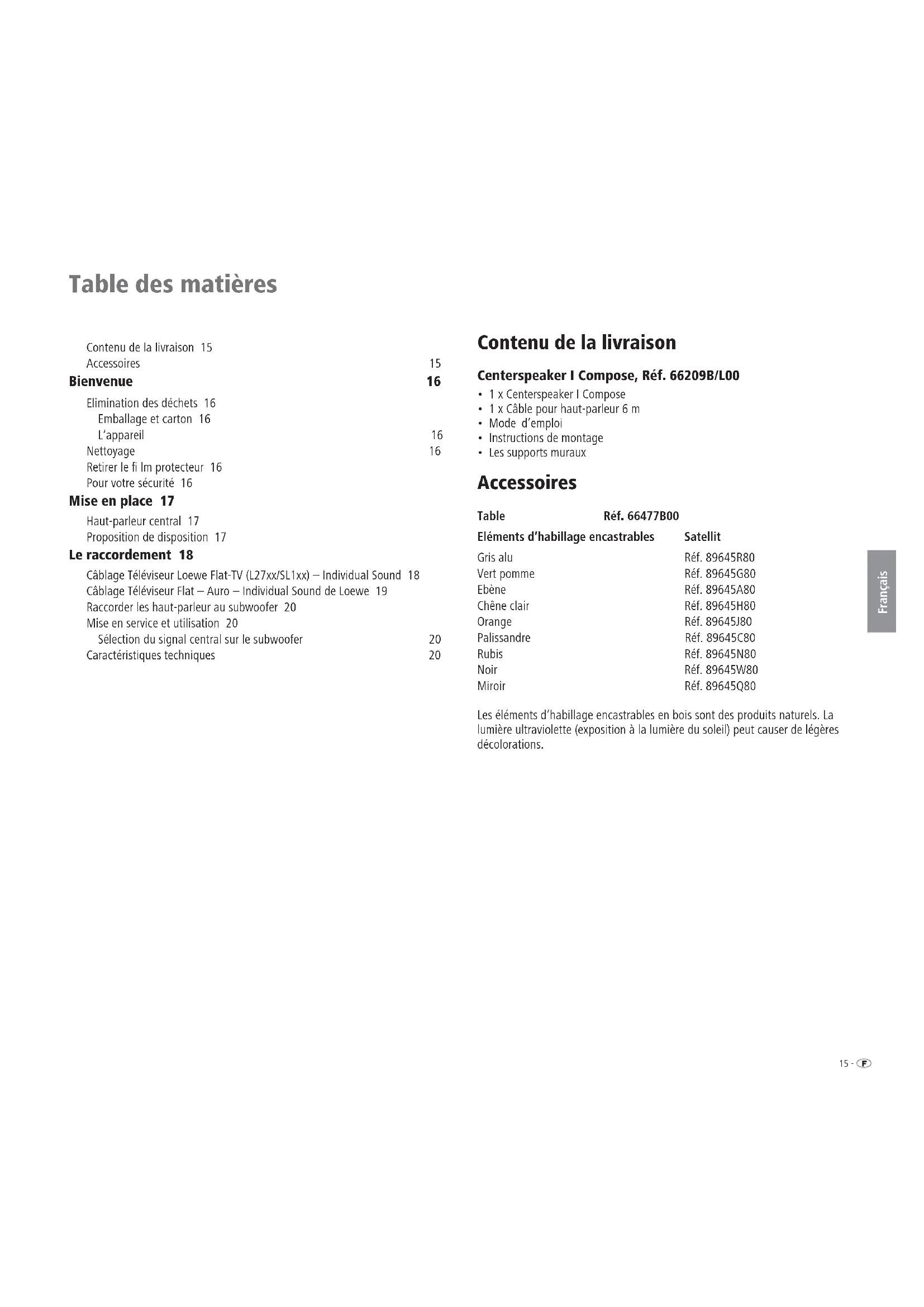 Front left FrontrightSurround left SurroundrightSubwooferCenter15 - Français Table des matières Contenu de la livraison 15 Accessoires 15 Bienvenue 16 Elimination des déchets 16 Emballage et carton 16 L‘appareil 16 Nettoyage 16 Retirer le lm protecteur 16 Pour votre sécurité 16 Mise en place 17 Haut-parleur central 17 Proposition de disposition 17 Le raccordement 18 Câblage Téléviseur Loewe Flat-TV (L27xx/SL1xx) – Individual Sound 18 Câblage Téléviseur Flat – Auro – Individual Sound de Loewe 19 Raccorder les haut-parleur au subwoofer 20 Mise en service et utilisation 20 Sélection du signal central sur le subwoofer 20 Caractéristiques techniques 20 Contenu de la livraison Centerspeaker I Compose, Réf. 66209B/L00