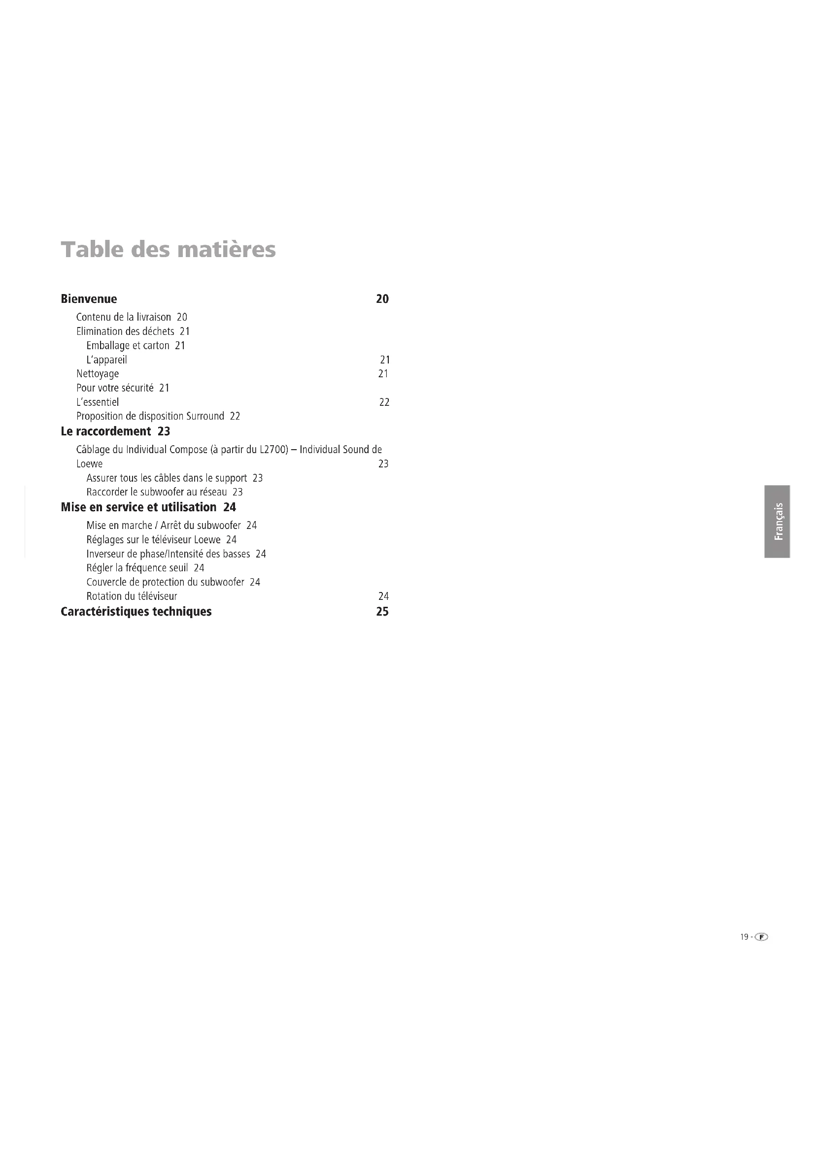 Setting the crossover frequency The “Crossover Frequency” knob gives you the possibility of setting the limit frequency for bass reproduction between 50 Hz and 250 Hz depending on which speakers you have connected. We recommend setting this to 120 Hz for the Center Stand. Cover on the subwoofer After you have made the settings described in “Start-up and operation”, replace the cover on the rear of the subwoofer. Turning the TV set The fully assembled unit of TV set and TV stand can be turned 45° to either side by hand.17 - English Technical Data Center Floor Stand I Compose Dimensions in cm Ø 50,2 x H 53,1 Weight in kgs 19,5 Principle 3 ways, d’Appolito arrangement Fitting 1x bass 80 mm, paper diaphragm 1x middle tone 80 mm, paper diaphragm 1x treble, coated fabric calotte, Ø 33mm Load capacity 50 W (sine) / 90 W (max. music) Impedance 4 -8 Ohm Transmission range 120 Hz–22 kHz ± 3dB Sound pressure 84 dB spl (1w/m) CH/07/05/A1 © by Loewe Opta 2007- 18 English19 - Français Table des matières Bienvenue 20 Contenu de la livraison 20 Elimination des déchets 21 Emballage et carton 21 L‘appareil 21 Nettoyage 21 Pour votre sécurité 21 L’essentiel 22 Proposition de disposition Surround 22 Le raccordement 23 Câblage du Individual Compose (à partir du L2700) – Individual Sound de Loewe 23 Assurer tous les câbles dans le support 23 Raccorder le subwoofer au réseau 23 Mise en service et utilisation 24 Mise en marche / Arrêt du subwoofer 24 Réglages sur le téléviseur Loewe 24 Inverseur de phase/Intensité des basses 24 Régler la fréquence seuil 24 Couvercle de protection du subwoofer 24 Rotation du téléviseur 24 Caractéristiques techniques 25- 20 Français Bienvenue Nous vous remercions d’avoir choisi un produit Loewe. Nous sommes ravis que vous soyez notre nouveau client. Avec le nom Loewe, nous allions les plus hautes exigences en matière de techni- que, d’esthétique et de convivialité. Ceci vaut de la même manière pour les téléviseurs, les lecteurs DVD, les magné- toscopes, les appareils audio et les accessoires. Pourtant, ni la technique ni l‘esthétique ne sont des buts en soi, mais doivent au contraire offrir à nos clients le plaisir maximum pour l‘œil et pour l‘oreille. En ce qui concerne l‘esthétique, nous ne nous sommes pas non plus laissés guider par les tendances éphémères de la mode. En effet, vous avez acquis un appareil de haute qualité et dont vous voulez également profi ter demain et après-demain. Le système de haut-parleurs Individual Sound est conçu pour les téléviseurs Flat de Loewe. Le système de haut-parleurs peut toutefois être étendu de la simple version stéréo jusqu’à la version haut de gamme avec quatre haut-parleurs sur pied, en passant par la variante avec quatre haut-parleurs Satellite et haut-parleur Center. Chaque version comprend également le subwoofer avec amplifi cateur intégré. Ainsi, vous avez la possibilité de restituer vos DVD avec la qualité sonore Dolby Digital propre aux salles de cinéma. Vous pouvez également convertir les émissions et lectures stéréo (du magnétoscope ou du lecteur DVD) en Dolby ProLogic, resp. Virtual ou Circle Surround en un signal quasi surround 5.1 et les restituer avec le système de haut-parleurs Individual. Si votre téléviseur (à partir de châssis L2700) est équipé d’un tuner numérique (DVB), le signal surround numérique reçu est décodé et restitué via l’installation Individual Sound. Le système de haut-parleurs Individual se met en marche et stoppe automati- quement avec le téléviseur Loewe ou le preceiver DVD Loewe. Vous pouvez procéder avec une grande facilité aux réglages pour Dolby Digital par l’intermédiaire du menu du téléviseur Flat de Loewe. Contenu de la livraison Center Floor Stand I Compose, Réf. 67207B/L00 Center Floor Stand I Compose Câble pour haut-parleur (6 m) Gaine fl exible en tissu Support pour gaine en tissu Mode d’emploi Notice de montage
