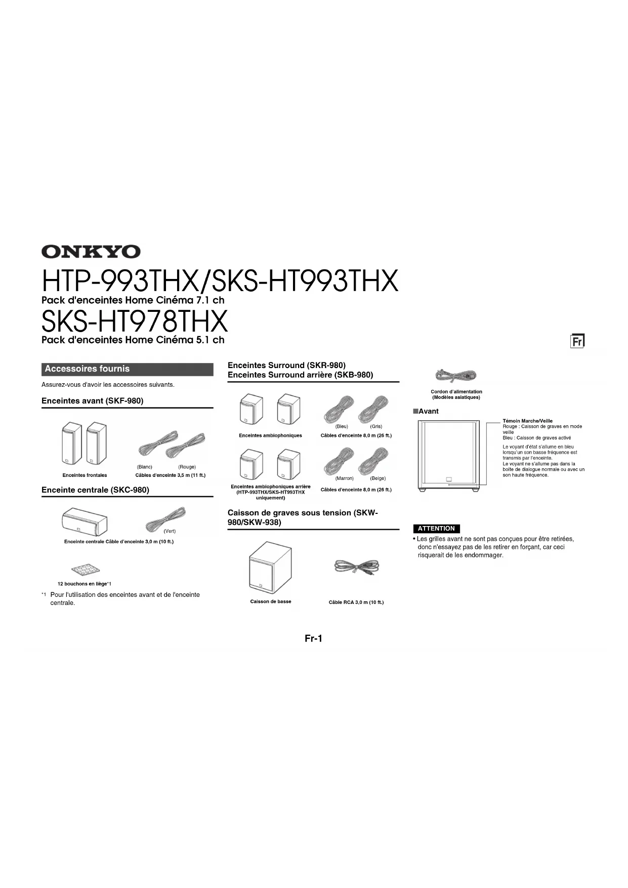 - Les grilles avant ne sont pas conçues pour être retirées, donc n'essayez pas de les retirer en forçant, car ceci risquerait de les endommager. Accessoires fournis Enceintes frontalesCâbles d'enceinte 3,5 m (11 ft.)Enceinte centrale Câble d’enceinte 3,0 m (10 ft.)12 bouchons en liège*1(Blanc)(Rouge)(Vert)Enceintes ambiophoniquesEnceintes ambiophoniques arrière(HTP-993THX/SKS-HT993THX uniquement)Câbles d'enceinte 8,0 m (26 ft.)Caisson de basseCâble RCA 3,0 m (10 ft.)(Bleu)(Gris)(Marron)(Beige)Câbles d'enceinte 8,0 m (26 ft.) Cordon d’alimentation(Modèles asiatiques) Témoin Marche/VeilleRouge : Caisson de graves en mode veilleBleu : Caisson de graves activéLe voyant d’état s’allume en bleu lorsqu’un son basse fréquence est transmis par l’enceinte.Le voyant ne s’allume pas dans la boîte de dialogue normale ou avec un son haute fréquence.