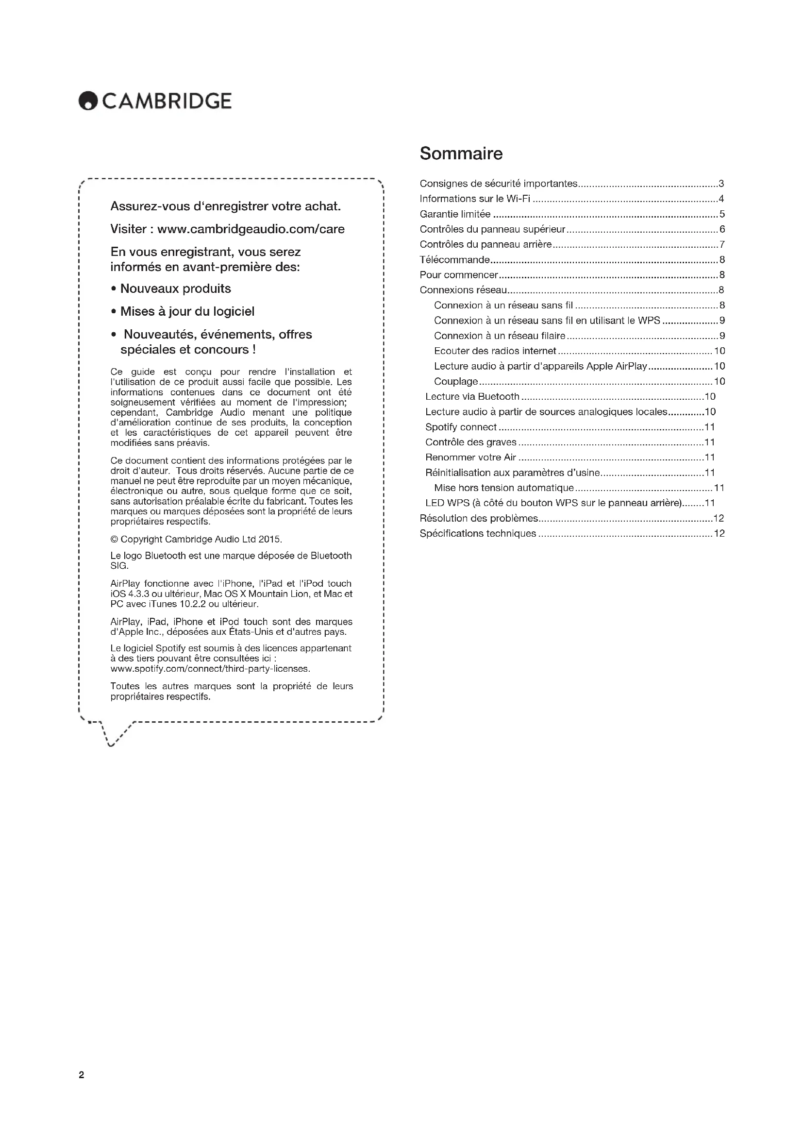 Ce guide est concu pour rendre l'installation et l'utilisation de ce produit aussi facile que possible. Les informations contenues dans ce document ont ete soigneusement verifiees au moment de l'impression; cependant, Cambridge Audio menant une politique d'amelioration continue de ses produits, la conception et les caractéristiques de cet apparil peuvent etre modifiees sans preavis.