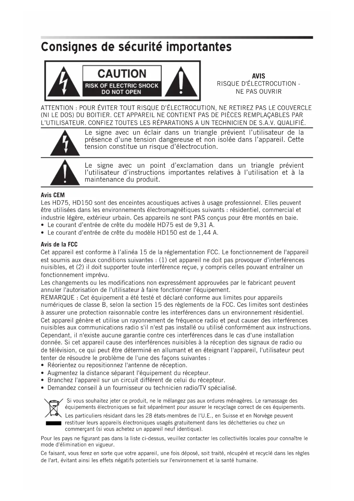 Les HD75, HD150 sont des enceintes acoustiques actives à usage professionnel. Elles peuvent être utilisées dans les environnements électromagnétiques suivants : résidentiel, commercial et industrie légère, extérieur urbain. Ces appareils ne sont PAS conçus pour être montés en baie.