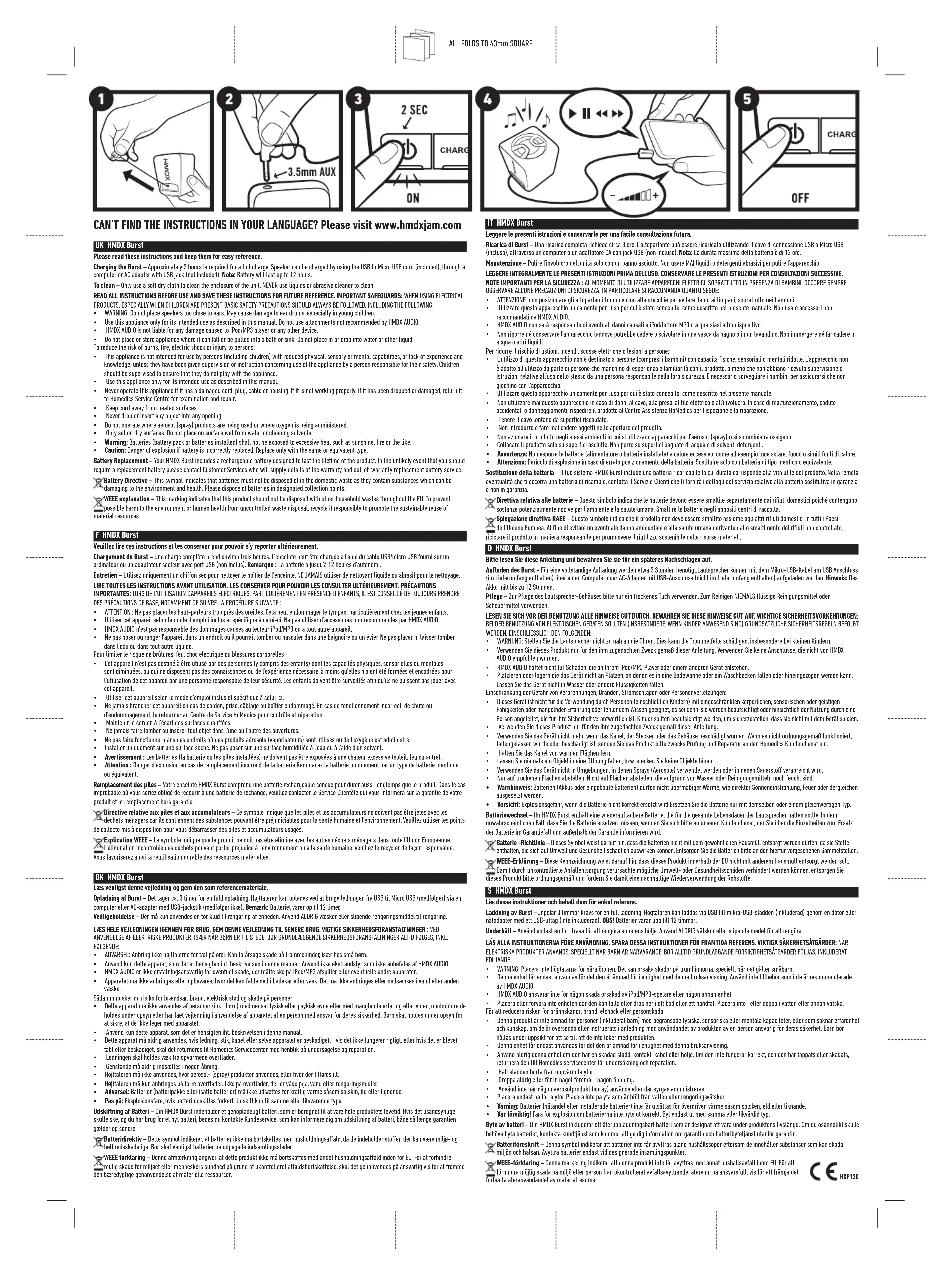 - Attention : Danger d’explosion en cas de remplacement incorrect de la batterie.Remplacez la batterie uniquement par un type de batterie identique ou équivalent. Remplacement des piles – Votre enceinte HMDX Burst comprend une batterie rechargeable conçue pour durer aussi longtemps que le produit. Dans le cas improbable où vous seriez obligé de recourir à une batterie de rechange, veuillez contacter le Service Clientèle qui vous informera sur la garantie de votre produit et le remplacement hors garantie. Directive relative aux piles et aux accumulateurs – Ce symbole indique que les piles et les accumulateurs ne doivent pas être jetés avec les déchets ménagers car ils contiennent des substances pouvant être préjudiciables pour la santé humaine et l’environnement. Veuillez utiliser les points de collecte mis à disposition pour vous débarrasser des piles et accumulateurs usagés. Explication WEEE – Le symbole indique que le produit ne doit pas être éliminé avec les autres déchets ménagers dans toute l’Union Européenne. L’élimination incontrôlée des déchets pouvant porter préjudice à l’environnement ou à la santé humaine, veuillez le recycler de façon responsable. Vous favoriserez ainsi la réutilisation durable des ressources matérielles. DK HMDX Burst Læs venligst denne vejledning og gem den som referencemateriale. Opladning af Burst – Det tager ca. 3 timer for en fuld opladning. Højttaleren kan oplades ved at bruge ledningen fra USB til Micro USB (medfølger) via en computer eller AC-adapter med USB-jackstik (medfølger ikke). Bemærk: Batteriet varer op til 12 timer. Vedligeholdelse – Der må kun anvendes en tør klud til rengøring af enheden. Anvend ALDRIG væsker eller slibende rengøringsmiddel til rengøring. LÆS HELE VEJLEDNINGEN IGENNEM FØR BRUG. GEM DENNE VEJLEDNING TIL SENERE BRUG. VIGTIGE SIKKERHEDSFORANSTALTNINGER : VED ANVENDELSE AF ELEKTRISKE PRODUKTER, ISÆR NÅR BØRN ER TIL STEDE, BØR GRUNDLÆGGENDE SIKKERHEDSFORANSTALTNINGER ALTID FØLGES, INKL. FØLGENDE: