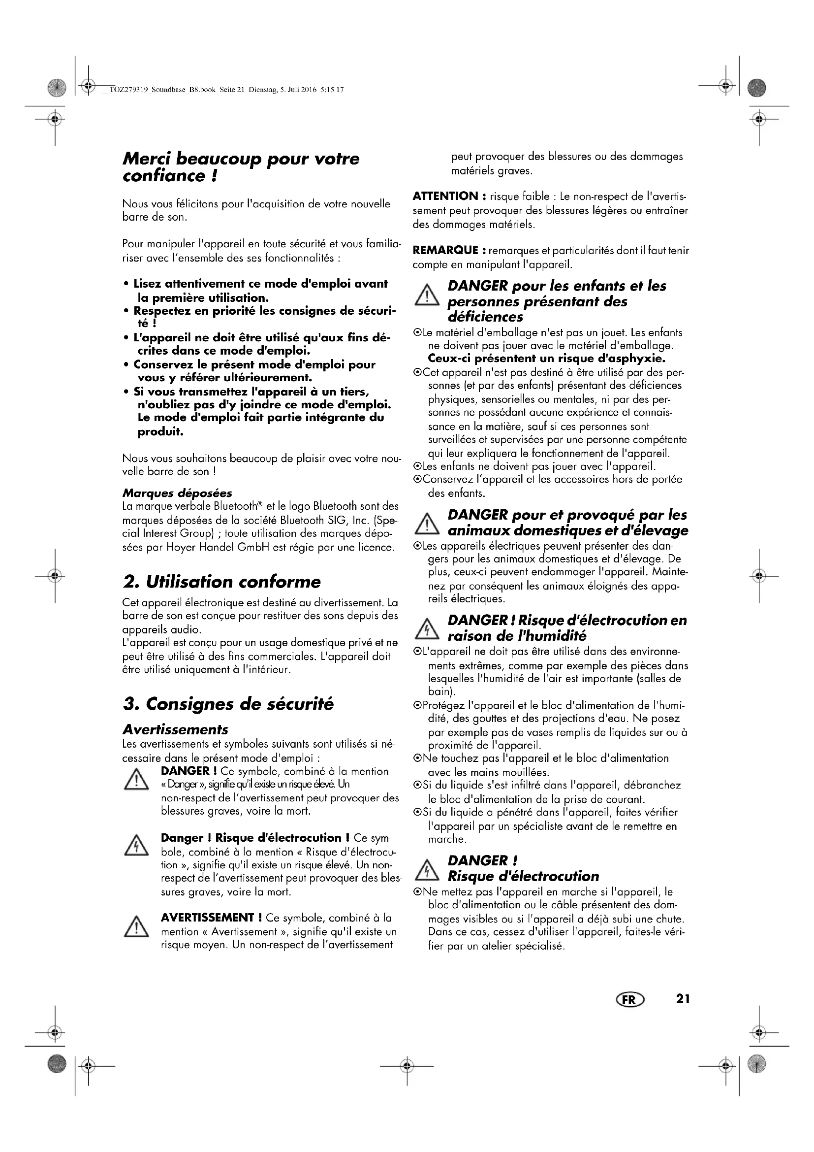- Si vous transmettez l'appareil à un tiers, n'oubliez pas d'y joindre ce mode d'emploi. Le mode d'emploi fait partie intégrante du produit. Nous vous souhaitons beaucoup de plaisir avec votre nou- velle barre de son ! Marques déposées La marque verbale Bluetooth