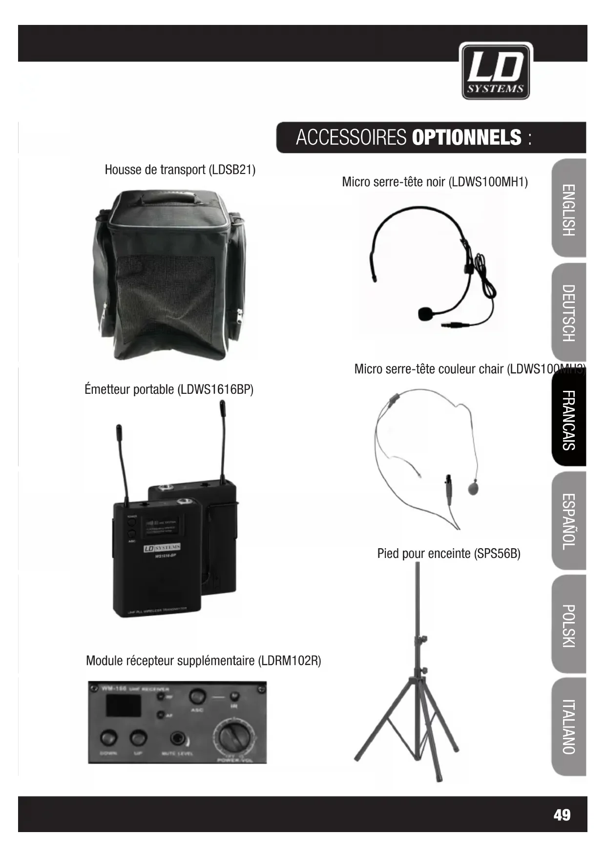 ITALIANO POLSKI ESPAÑOL FRANCAIS FRANCAIS FRANCAIS FRANCAIS FRANCAIS DEUTSCH ENGLISH DECLARATION WEEE Votre produit LD-Systems a été développé et fabriqué avec des matériaux et des composants de haute qualité, qui peuvent être recyclés et/ou réutilisés. Ce symbole indique que les appareils électriques et électroniques, à la fin de leur durée de vie opérationnelle, doivent être gérés séparément des déchets ordinaires. Veuillez apporter ce produit au point de collecte ou centre de recyclage local prévu pour de tels appareils. Vous contribuerez ainsi à la protection de l'environnement dans lequel nous vivons tous.