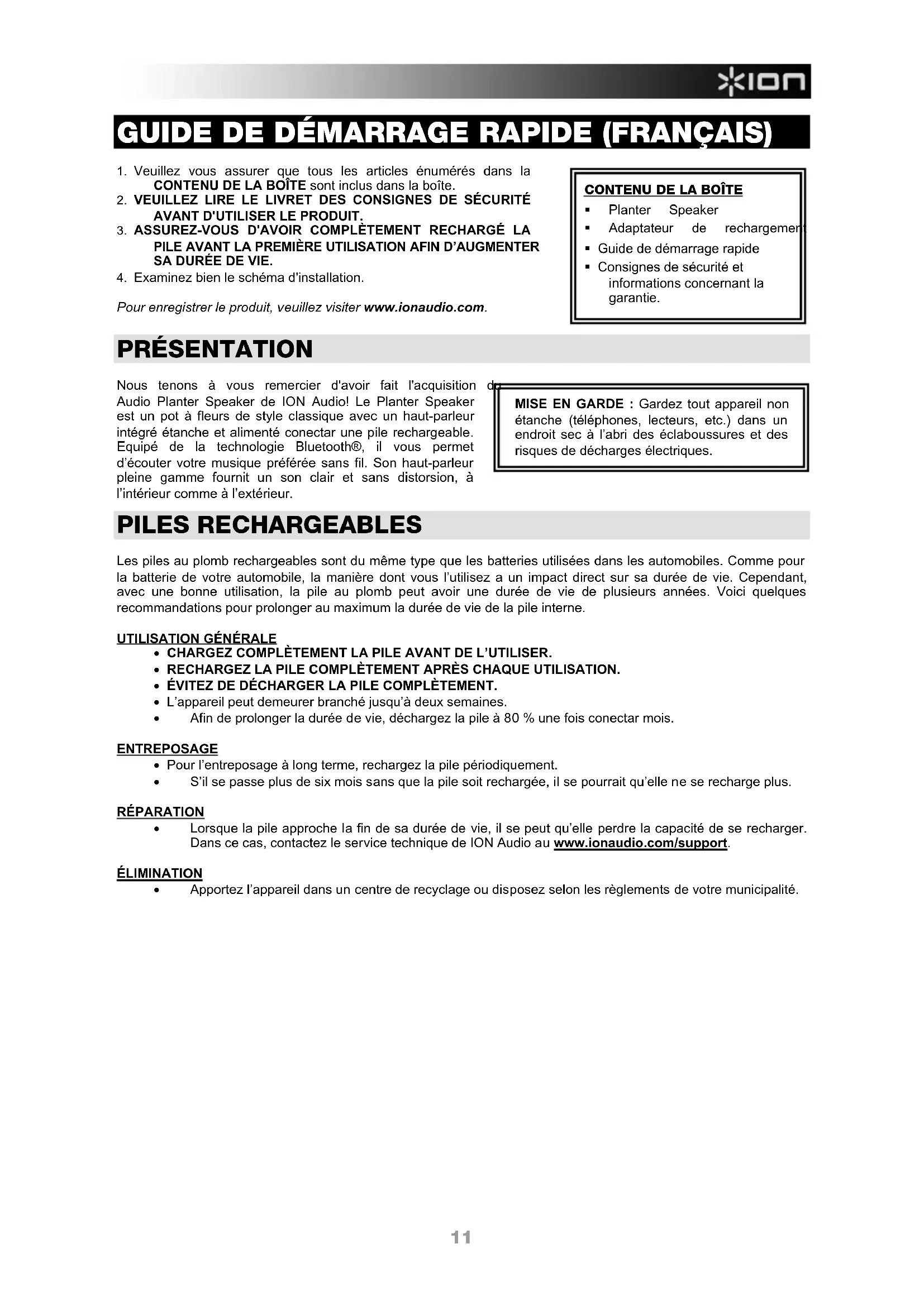PRÉSENTATION Nous tenons à vous remercier d'avoir fait l'acquisition du Audio Planter Speaker de ION Audio! Le Planter Speaker est un pot à fleurs de style classique avec un haut-parleur intégré étanche et alimenté conectar une pile rechargeable. Equipé de la technologie Bluetooth®, il vous permet d’écouter votre musique préférée sans fil. Son haut-parleur pleine gamme fournit un son clair et sans distorsion, à l’intérieur comme à l’extérieur. PILES RECHARGEABLES Les piles au plomb rechargeables sont du même type que les batteries utilisées dans les automobiles. Comme pour la batterie de votre automobile, la manière dont vous l’utilisez a un impact direct sur sa durée de vie. Cependant, avec une bonne utilisation, la pile au plomb peut avoir une durée de vie de plusieurs années. Voici quelques recommandations pour prolonger au maximum la durée de vie de la pile interne.