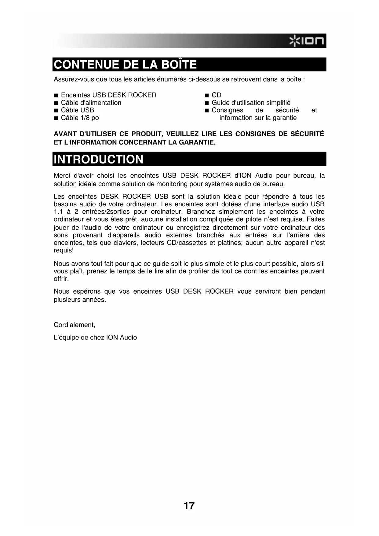 Guide d'utilisation simplifié Consignes de sécurité et information sur la garantie AVANT D'UTILISER CE PRODUIT, VEUILLEZ LIRE LES CONSIGNES DE SÉCURITÉ ET L'INFORMATION CONCERNANT LA GARANTIE. INTRODUCTION Merci d'avoir choisi les enceintes USB DESK ROCKER d'ION Audio pour bureau, la solution idéale comme solution de monitoring pour systèmes audio de bureau. Les enceintes DESK ROCKER USB sont la solution idéale pour répondre à tous les besoins audio de votre ordinateur. Les enceintes sont dotées d’une interface audio USB