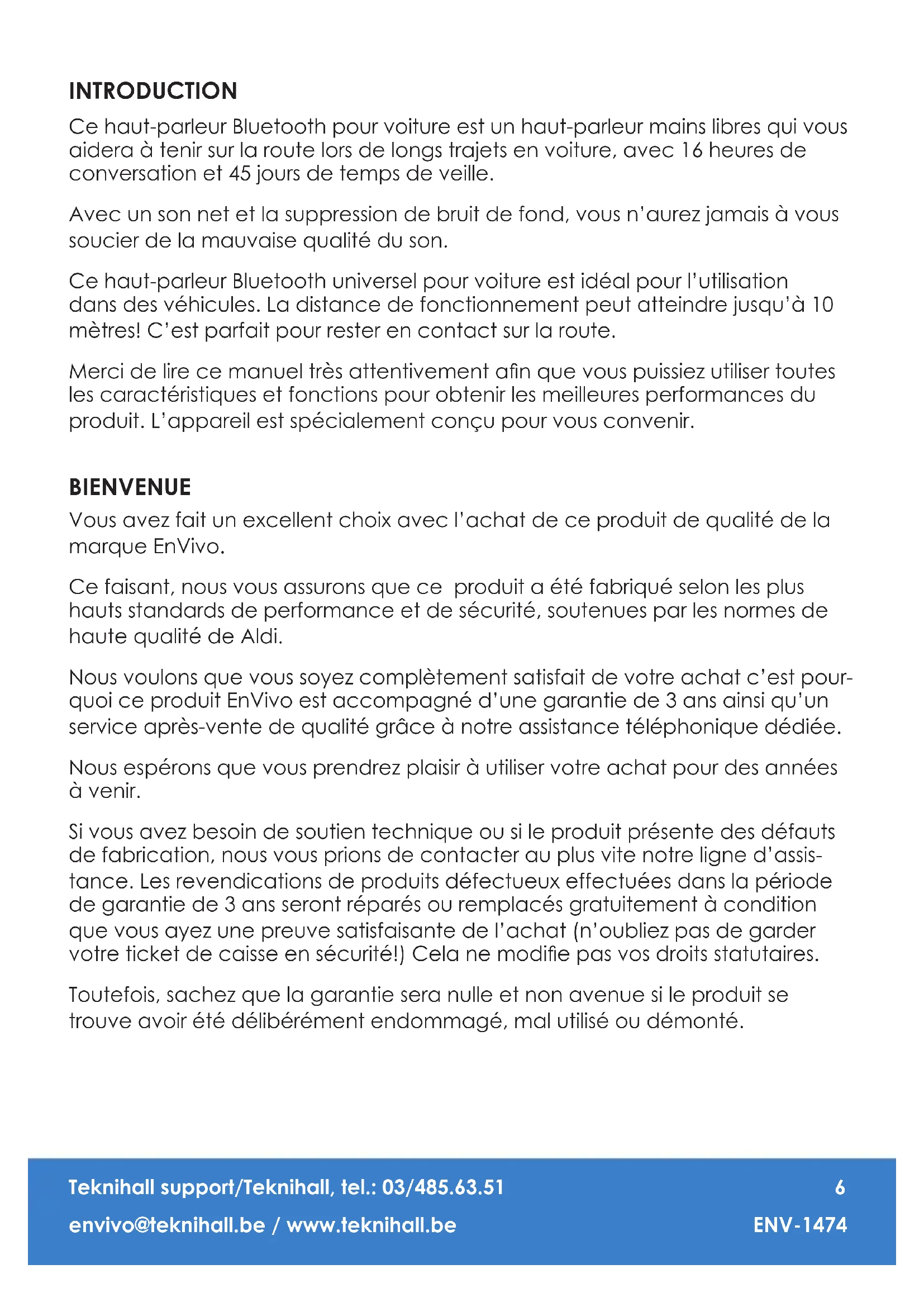 INTRODUCTION Ce haut-parleur Bluetooth pour voiture est un haut-parleur mains libres qui vous aidera à tenir sur la route lors de longs trajets en voiture, avec 16 heures de conversation et 45 jours de temps de veille Avec un son net et la suppression de bruit de fond, vous n’aurez jamais à vous soucier de la mauvaise qualité du son Ce haut-parleur Bluetooth universel pour voiture est idéal pour l’utilisation dans des véhicules La distance de fonctionnement peut atteindre jusqu’à 10 mètres! C’est parfait pour rester en contact sur la route Merci de lire ce manuel très attentivement an que vous puissiez utiliser toutes les caractéristiques et fonctions pour obtenir les meilleures performances du produit L’appareil est spécialement conçu pour vous convenir BIENVENUE Vous avez fait un excellent choix avec l’achat de ce produit de qualité de la marque EnVivo Ce faisant, nous vous assurons que ce produit a été fabriqué selon les plus hauts standards de performance et de sécurité, soutenues par les normes de haute qualité de Aldi Nous voulons que vous soyez complètement satisfait de votre achat c’est pour- quoi ce produit EnVivo est accompagné d’une garantie de 3 ans ainsi qu’un service après-vente de qualité grâce à notre assistance téléphonique dédiée Nous espérons que vous prendrez plaisir à utiliser votre achat pour des années à venir Si vous avez besoin de soutien technique ou si le produit présente des défauts de fabrication, nous vous prions de contacter au plus vite notre ligne d’assis- tance Les revendications de produits défectueux effectuées dans la période de garantie de 3 ans seront réparés ou remplacés gratuitement à condition que vous ayez une preuve satisfaisante de l’achat (n’oubliez pas de garder votre ticket de caisse en sécurité!) Cela ne modie pas vos droits statutaires. Toutefois, sachez que la garantie sera nulle et non avenue si le produit se trouve avoir été délibérément endommagé, mal utilisé ou démontéTeknihall support/Teknihall, tel.: 03/485.63.51 envivo@teknihall.be / www.teknihall.be ENV-1474
