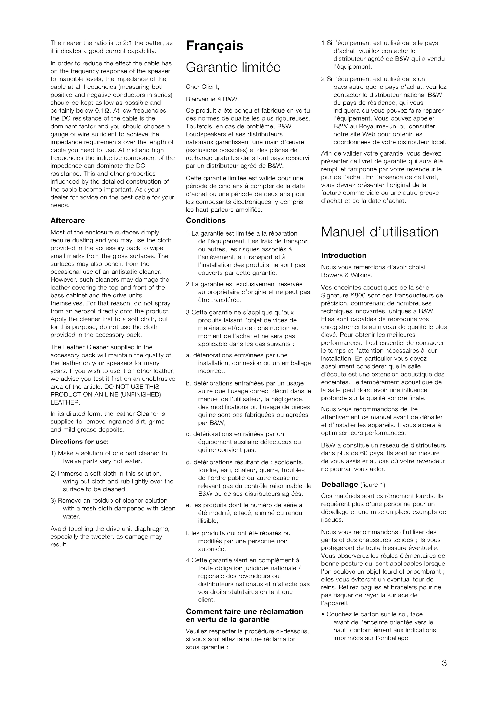 with a fresh cloth dampened with clean water. Avoid touching the drive unit diaphragms, especially the tweeter, as damage may result. Français Garantie limitée Cher Client, Bienvenue à B&W. Ce produit a été conçu et fabriqué en vertu des normes de qualité les plus rigoureuses. Toutefois, en cas de problème, B&W Loudspeakers et ses distributeurs nationaux garantissent une main d’œuvre (exclusions possibles) et des pièces de rechange gratuites dans tout pays desservi par un distributeur agréé de B&W. Cette garantie limitée est valide pour une période de cinq ans à compter de la date d’achat ou une période de deux ans pour les composants électroniques, y compris les haut-parleurs amplifiés. Conditions 1 La garantie est limitée à la réparation de l’équipement. Les frais de transport ou autres, les risques associés à l’enlèvement, au transport et à l’installation des produits ne sont pas couverts par cette garantie. 2 La garantie est exclusivement réservée au propriétaire d’origine et ne peut pas être transférée. 3 Cette garantie ne s’applique qu’aux produits faisant l’objet de vices de matériaux et/ou de construction au moment de l’achat et ne sera pas applicable dans les cas suivants : a. détériorations entraînées par une installation, connexion ou un emballage incorrect, b. détériorations entraînées par un usage autre que l’usage correct décrit dans le manuel de l’utilisateur, la négligence, des modifications ou l’usage de pièces qui ne sont pas fabriquées ou agréées par B&W, c. détériorations entraînées par un équipement auxiliaire défectueux ou qui ne convient pas, d. détériorations résultant de : accidents, foudre, eau, chaleur, guerre, troubles de l’ordre public ou autre cause ne relevant pas du contrôle raisonnable de B&W ou de ses distributeurs agréés, e. les produits dont le numéro de série a été modifié, effacé, éliminé ou rendu illisible, f. les produits qui ont été réparés ou modifiés par une personne non autorisée. 4 Cette garantie vient en complément à toute obligation juridique nationale / régionale des revendeurs ou distributeurs nationaux et n’affecte pas vos droits statutaires en tant que client. Comment faire une réclamation en vertu de la garantie Veuillez respecter la procédure ci-dessous, si vous souhaitez faire une réclamation sous garantie : 1 Si l’équipement est utilisé dans le pays d’achat, veuillez contacter le distributeur agréé de B&W qui a vendu l’équipement. 2 Si l’équipement est utilisé dans un pays autre que le pays d’achat, veuillez contacter le distributeur national B&W du pays de résidence, qui vous indiquera où vous pouvez faire réparer l’équipement. Vous pouvez appeler B&W au Royaume-Uni ou consulter notre site Web pour obtenir les coordonnées de votre distributeur local. Afin de valider votre garantie, vous devrez présenter ce livret de garantie qui aura été rempli et tamponné par votre revendeur le jour de l’achat. En l’absence de ce livret, vous devrez présenter l’original de la facture commerciale ou une autre preuve d’achat et de la date d’achat. Manuel d’utilisation Introduction Nous vous remercions d’avoir choisi Bowers & Wilkins. Vos enceintes acoustiques de la série Signature™800 sont des transducteurs de précision, comprenant de nombreuses techniques innovantes, uniques à B&W. Elles sont capables de reproduire vos enregistrements au niveau de qualité le plus élevé. Pour obtenir les meilleures performances, il est essentiel de consacrer le temps et l’attention nécessaires à leur installation. En particulier vous devez absolument considérer que la salle d’écoute est une extension acoustique des enceintes. Le tempérament acoustique de la salle peut donc avoir une influence profonde sur la qualité sonore finale. Nous vous recommandons de lire attentivement ce manuel avant de déballer et d’installer les appareils. Il vous aidera à optimiser leurs performances. B&W a constitué un réseau de distributeurs dans plus de 60 pays. Ils sont en mesure de vous assister au cas où votre revendeur ne pourrait vous aider. Deballage (figure 1) Ces matériels sont extrêmement lourds. Ils requièrent plus d’une personne pour un déballage et une mise en place exempts de risques. Nous vous recommandons d’utiliser des gants et des chaussures solides ; ils vous protègeront de toute blessure éventuelle. Vous observerez les règles élémentaires de bonne posture qui sont applicables lorsque l’on soulève un objet lourd et encombrant ; elles vous éviteront un eventual tour de reins. Retirez bagues et bracelets pour ne pas risquer de rayer la surface de l’appareil.