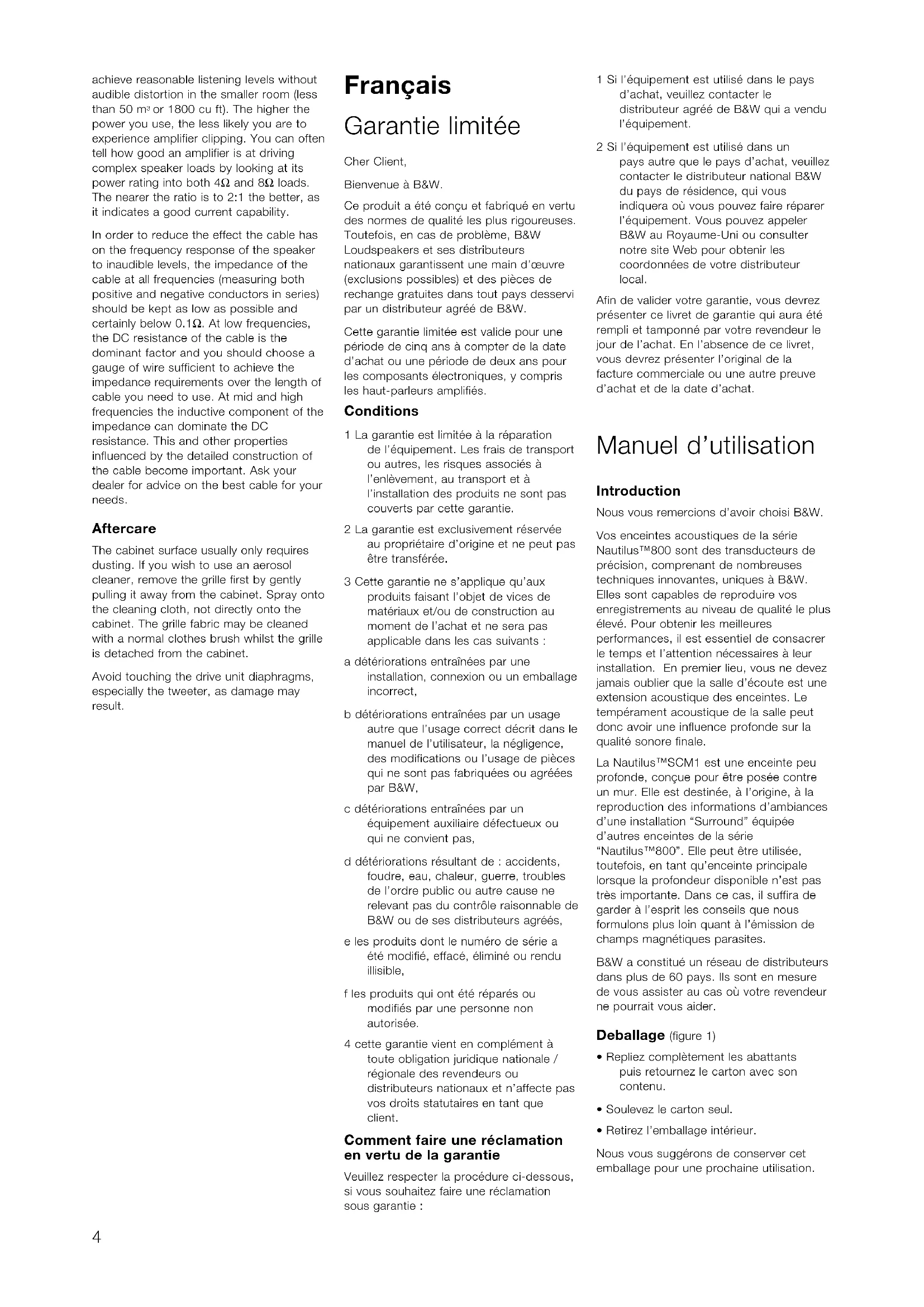 or 1800 cu ft). The higher the power you use, the less likely you are to experience amplifier clipping. You can often tell how good an amplifier is at driving complex speaker loads by looking at its power rating into both 4Ω and 8Ω loads. The nearer the ratio is to 2:1 the better, as it indicates a good current capability. In order to reduce the effect the cable has on the frequency response of the speaker to inaudible levels, the impedance of the cable at all frequencies (measuring both positive and negative conductors in series) should be kept as low as possible and certainly below 0.1Ω. At low frequencies, the DC resistance of the cable is the dominant factor and you should choose a gauge of wire sufficient to achieve the impedance requirements over the length of cable you need to use. At mid and high frequencies the inductive component of the impedance can dominate the DC resistance. This and other properties influenced by the detailed construction of the cable become important. Ask your dealer for advice on the best cable for your needs. Aftercare The cabinet surface usually only requires dusting. If you wish to use an aerosol cleaner, remove the grille first by gently pulling it away from the cabinet. Spray onto the cleaning cloth, not directly onto the cabinet. The grille fabric may be cleaned with a normal clothes brush whilst the grille is detached from the cabinet. Avoid touching the drive unit diaphragms, especially the tweeter, as damage may result. Français Garantie limitée Cher Client, Bienvenue à B&W. Ce produit a été conçu et fabriqué en vertu des normes de qualité les plus rigoureuses. Toutefois, en cas de problème, B&W Loudspeakers et ses distributeurs nationaux garantissent une main d’œuvre (exclusions possibles) et des pièces de rechange gratuites dans tout pays desservi par un distributeur agréé de B&W. Cette garantie limitée est valide pour une période de cinq ans à compter de la date d’achat ou une période de deux ans pour les composants électroniques, y compris les haut-parleurs amplifiés. Conditions 1 La garantie est limitée à la réparation de l’équipement. Les frais de transport ou autres, les risques associés à l’enlèvement, au transport et à l’installation des produits ne sont pas couverts par cette garantie. 2 La garantie est exclusivement réservée au propriétaire d’origine et ne peut pas être transférée. 3 Cette garantie ne s’applique qu’aux produits faisant l’objet de vices de matériaux et/ou de construction au moment de l’achat et ne sera pas applicable dans les cas suivants : a détériorations entraînées par une installation, connexion ou un emballage incorrect, b détériorations entraînées par un usage autre que l’usage correct décrit dans le manuel de l’utilisateur, la négligence, des modifications ou l’usage de pièces qui ne sont pas fabriquées ou agréées par B&W, c détériorations entraînées par un équipement auxiliaire défectueux ou qui ne convient pas, d détériorations résultant de : accidents, foudre, eau, chaleur, guerre, troubles de l’ordre public ou autre cause ne relevant pas du contrôle raisonnable de B&W ou de ses distributeurs agréés, e les produits dont le numéro de série a été modifié, effacé, éliminé ou rendu illisible, f les produits qui ont été réparés ou modifiés par une personne non autorisée. 4 cette garantie vient en complément à toute obligation juridique nationale / régionale des revendeurs ou distributeurs nationaux et n’affecte pas vos droits statutaires en tant que client. Comment faire une réclamation en vertu de la garantie Veuillez respecter la procédure ci-dessous, si vous souhaitez faire une réclamation sous garantie : 1 Si l’équipement est utilisé dans le pays d’achat, veuillez contacter le distributeur agréé de B&W qui a vendu l’équipement. 2 Si l’équipement est utilisé dans un pays autre que le pays d’achat, veuillez contacter le distributeur national B&W du pays de résidence, qui vous indiquera où vous pouvez faire réparer l’équipement. Vous pouvez appeler B&W au Royaume-Uni ou consulter notre site Web pour obtenir les coordonnées de votre distributeur local. Afin de valider votre garantie, vous devrez présenter ce livret de garantie qui aura été rempli et tamponné par votre revendeur le jour de l’achat. En l’absence de ce livret, vous devrez présenter l’original de la facture commerciale ou une autre preuve d’achat et de la date d’achat. Manuel d’utilisation Introduction Nous vous remercions d’avoir choisi B&W. Vos enceintes acoustiques de la série Nautilus™800 sont des transducteurs de précision, comprenant de nombreuses techniques innovantes, uniques à B&W. Elles sont capables de reproduire vos enregistrements au niveau de qualité le plus élevé. Pour obtenir les meilleures performances, il est essentiel de consacrer le temps et l’attention nécessaires à leur installation. En premier lieu, vous ne devez jamais oublier que la salle d’écoute est une extension acoustique des enceintes. Le tempérament acoustique de la salle peut donc avoir une influence profonde sur la qualité sonore finale. La Nautilus™SCM1 est une enceinte peu profonde, conçue pour être posée contre un mur. Elle est destinée, à l’origine, à la reproduction des informations d’ambiances d’une installation “Surround” équipée d’autres enceintes de la série “Nautilus™800”. Elle peut être utilisée, toutefois, en tant qu’enceinte principale lorsque la profondeur disponible n’est pas très importante. Dans ce cas, il suffira de garder à l’esprit les conseils que nous formulons plus loin quant à l’émission de champs magnétiques parasites. B&W a constitué un réseau de distributeurs dans plus de 60 pays. Ils sont en mesure de vous assister au cas où votre revendeur ne pourrait vous aider. Deballage (figure 1)