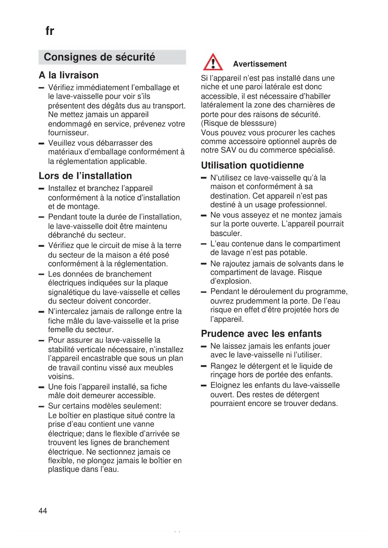 Consignes de sécurité A la livraison Vérifiez immédiatement l’emballage et le lave-vaisselle pour voir s’ils présentent des dégâts dus au transport. Ne mettez jamais un appareil endommagé en service, prévenez votre fournisseur. Veuillez vous débarrasser des matériaux d’emballage conformément à la réglementation applicable. Lors de l’installation Installez et branchez l’appareil conformément à la notice d’installation et de montage. Pendant toute la durée de l’installation, le lave-vaisselle doit être maintenu débranché du secteur. Vérifiez que le circuit de mise à la terre du secteur de la maison a été posé conformément à la réglementation. Les données de branchement électriques indiquées sur la plaque signalétique du lave-vaisselle et celles du secteur doivent concorder. N’intercalez jamais de rallonge entre la fiche mâle du lave-vaisselle et la prise femelle du secteur. Pour assurer au lave-vaisselle la stabilité verticale nécessaire, n’installez l’appareil encastrable que sous un plan de travail continu vissé aux meubles voisins. Une fois l’appareil installé, sa fiche mâle doit demeurer accessible. Sur certains modèles seulement: Le boîtier en plastique situé contre la prise d’eau contient une vanne électrique; dans le flexible d’arrivée se trouvent les lignes de branchement électrique. Ne sectionnez jamais ce flexible, ne plongez jamais le boîtier en plastique dans l’eau. Avertissement Si l’appareil n’est pas installé dans une niche et une paroi latérale est donc accessible, il est nécessaire d’habiller latéralement la zone des charnières de porte pour des raisons de sécurité. (Risque de blesssure) Vous pouvez vous procurer les caches comme accessoire optionnel auprès de notre SAV ou du commerce spécialisé. Utilisation quotidienne N’utilisez ce lave-vaisselle qu’à la maison et conformément à sa destination. Cet appareil n’est pas destiné à un usage professionnel. Ne vous asseyez et ne montez jamais sur la porte ouverte. L’appareil pourrait basculer. L’eau contenue dans le compartiment de lavage n’est pas potable. Ne rajoutez jamais de solvants dans le compartiment de lavage. Risque d’explosion. Pendant le déroulement du programme, ouvrez prudemment la porte. De l’eau risque en effet d’être projetée hors de l’appareil. Prudence avec les enfants Ne laissez jamais les enfants jouer avec le lave-vaisselle ni l’utiliser. Rangez le détergent et le liquide de rinçage hors de portée des enfants. Eloignez les enfants du lave-vaisselle ouvert. Des restes de détergent pourraient encore se trouver dedans.fr