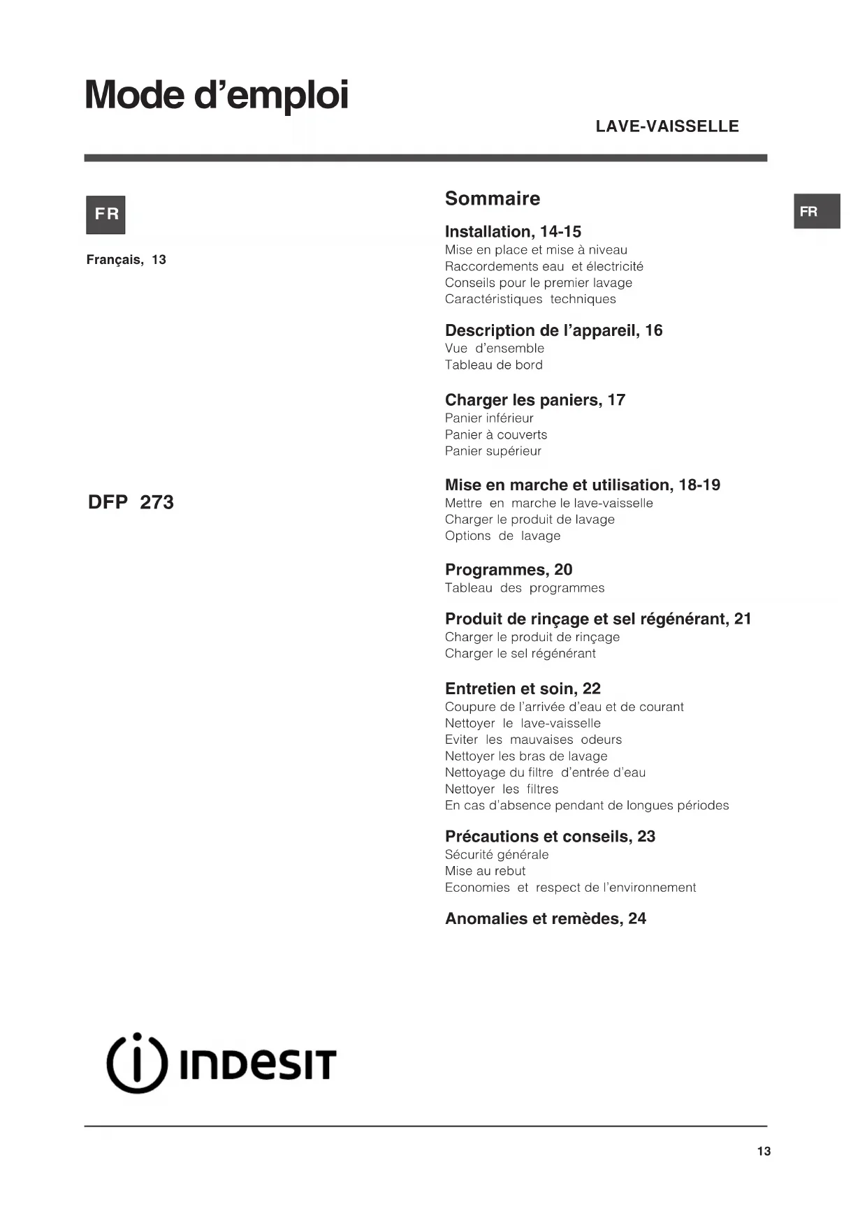 DFP 273 NX - Lave-vaisselle INDESIT - Notice d'utilisation et mode d'emploi gratuit