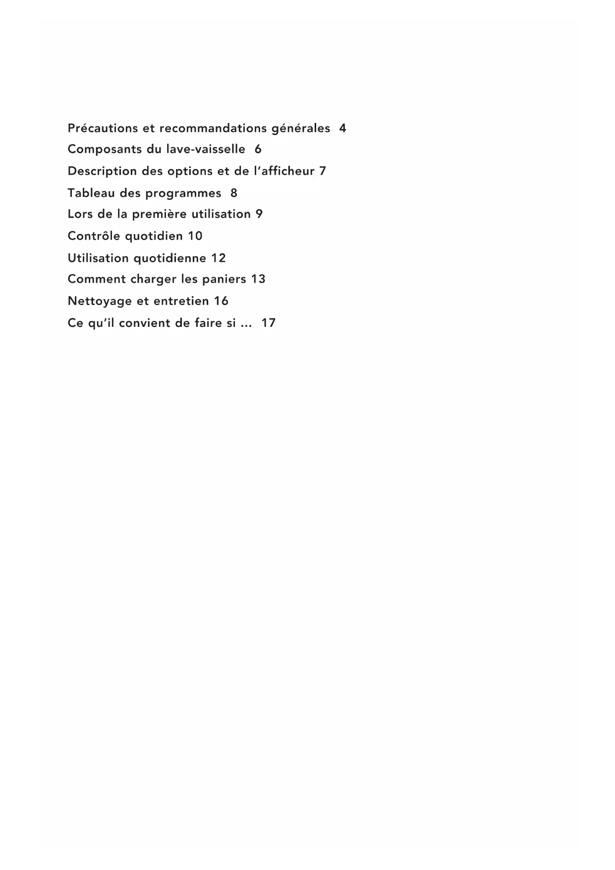 Mode d’emploiPrécautions et recommandations générales 4 Composants du lave-vaisselle 6 Description des options et de l’afficheur 7 Tableau des programmes 8 Lors de la première utilisation 9 Contrôle quotidien 10 Utilisation quotidienne 12 Comment charger les paniers 13 Nettoyage et entretien 16 Ce qu’il convient de faire si ... 174