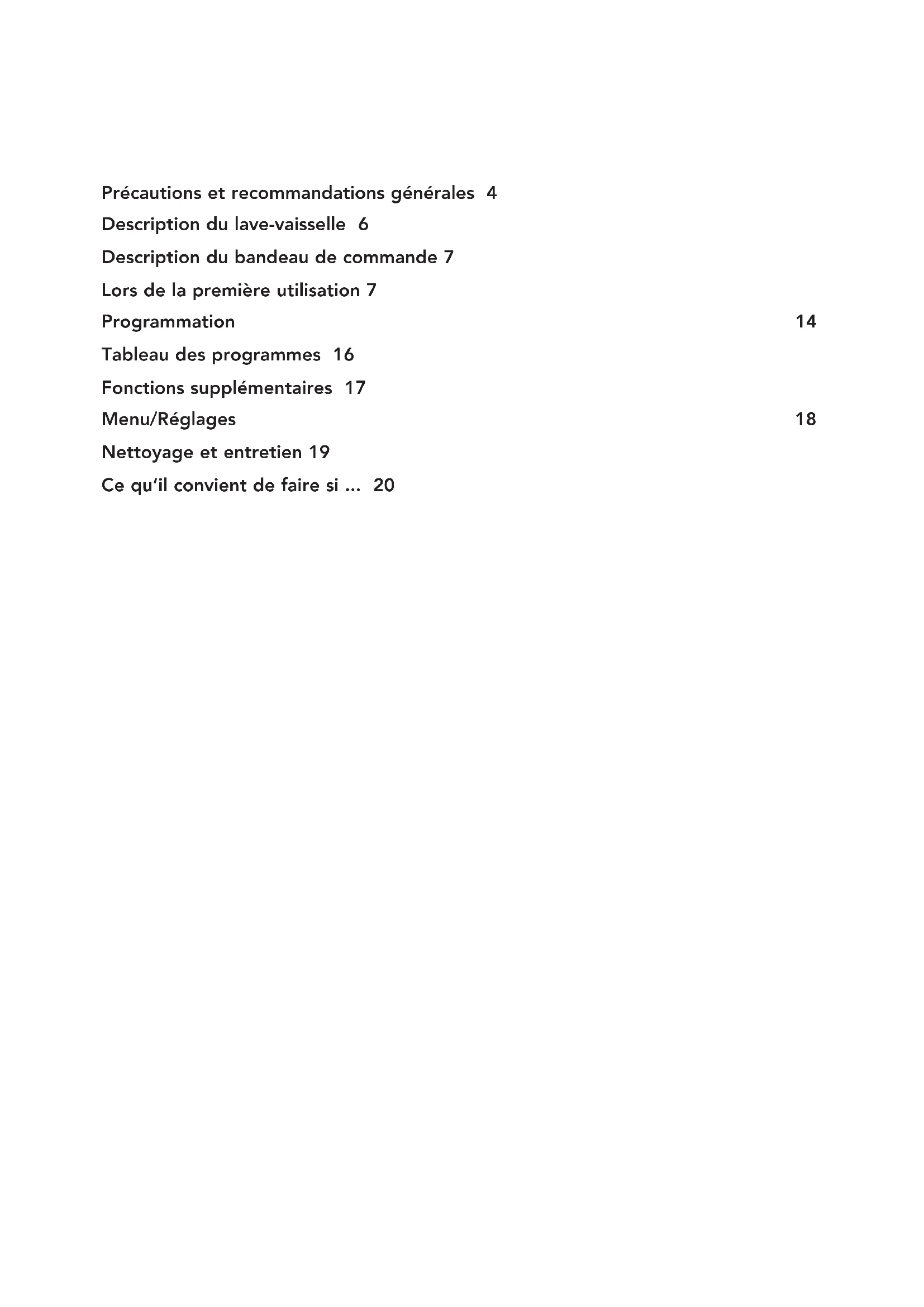 Mode d’emploiPrécautions et recommandations générales 4 Description du lave-vaisselle 6 Description du bandeau de commande 7 Lors de la première utilisation 7 Programmation 14 Tableau des programmes 16 Fonctions supplémentaires 17 Menu/Réglages 18 Nettoyage et entretien 19 Ce qu’il convient de faire si ... 204
