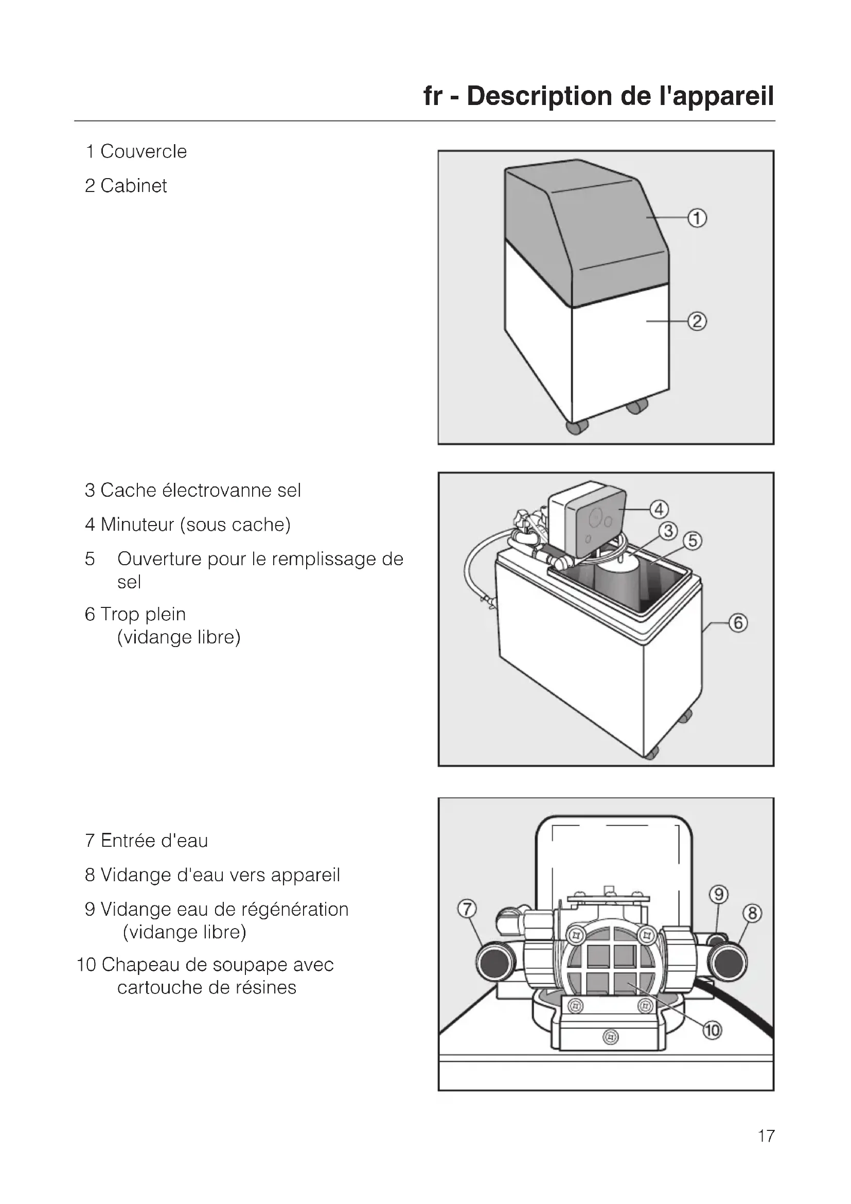 sible la condensation. L'adoucisseur est maintenant prêt à fonctionner et fournit de l'eau adoucie. Contactez le SAV Miele en cas de problèmes. fr - Indications concernant l'utilisation 22Dimensions : H 572 / L 230 / P 400 mm Raccordement à l'eau dure et douce : R 3/4" Cartouche de résines : Pièce6x13" Contenu : 4 l +/- 10 % Sybron Chemicals - Dow Chemical Comp. Rendement : 15 l/min (temporairement à 20 l/min) Pression min. : sans/avec adoucisseur dans les appareils à eau renouvelée : 200 kPa (2,0 bar) / 600 kPa (6,0 bar) sans/avec adoucisseur dans les appareils avec réservoir d'eau : 200 kPa (2,0 bar) / 600 kPa (6,0 bar) Pression statique max. : 600 kPa (6,0 bar) Différence de pression : max. 100 kPa (1 bar) avec 10 l/min Température : 4 °C - 65 °C Consommation de sel : 0,5 kg NaCl/Regen. +/- 10 % Consommation d'eau : 55 l/Regen. +/- 10 % Durée de régénération : 30 minutes +/- 10 % Capacité / diff. : +/- 10 % Réserve de sel : 10 kg Forme de tablette : ronde, env.Ø=25mm,h=14mm Tension : voir la plaque signalétique du connecteur Puissance de raccordement : voir la plaque signalétique du connecteur Fusibles : voir la plaque signalétique du connecteur fr - Données techniques 231 coperchio 2 involucro 3 copertura valvola sale 4 orologio programmatore (sotto il coperchio) 5 apertura per l'introduzione del sale 6 trabocco (scarico libero) 7 ingresso acqua 8 uscita acqua verso la macchina 9 scarico acqua di rigenerazione (scarico libero) 10 testa della valvola con capsula depuratore it - Descrizione 24Funzionamento Il depuratore monoblocco PG 8090 vie