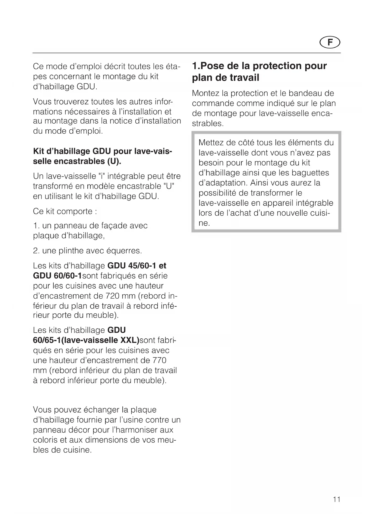 mations nécessaires à l’installation et au montage dans la notice d’installation du mode d’emploi. Kit d’habillage GDU pour lave-vais