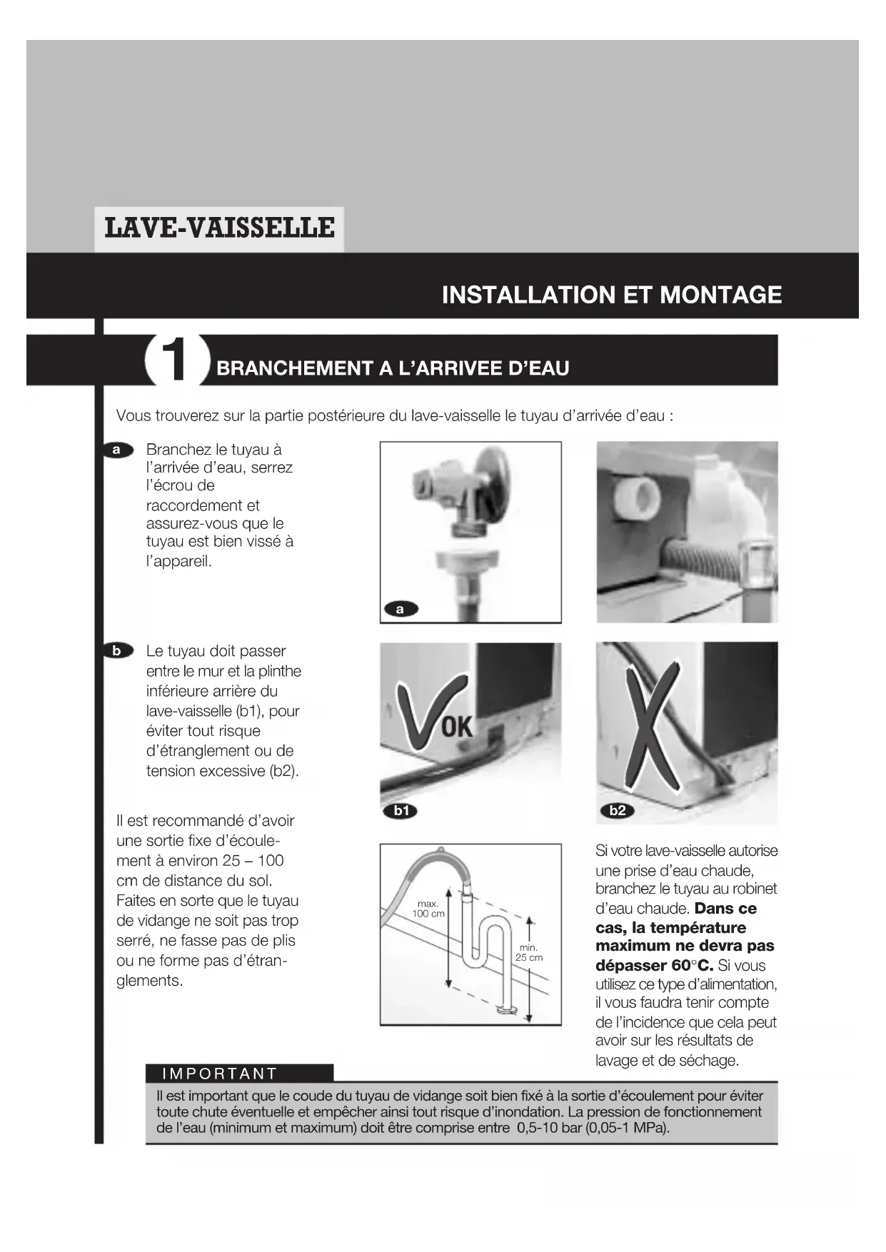 Si votre lave-vaisselle autorise une prise d’eau chaude, branchez le tuyau au robinet d’eau chaude. Dans ce cas, la température maximum ne devra pas dépasser 60°C. Si vous utilisez ce type d’alimentation, il vous faudra tenir compte de l’incidence que cela peut avoir sur les résultats de lavage et de séchage. max. 100 cm min. 25 cmIl est important que le coude du tuyau de vidange soit bien fixé à la sortie d’écoulement pour évitertoute chute éventuelle et empêcher ainsi tout risque d’inondation. La pression de fonctionnementde l’eau (minimum et maximum) doit être comprise entre 0,5-10 bar (0,05-1 MPa).IMPORTANT Branchez le tuyau à l’arrivée d’eau, serrez l’écrou de raccordement et assurez-vous que le tuyau est bien vissé à l’appareil. Vous trouverez sur la partie postérieure du lave-vaisselle le tuyau d’arrivée d’eau :