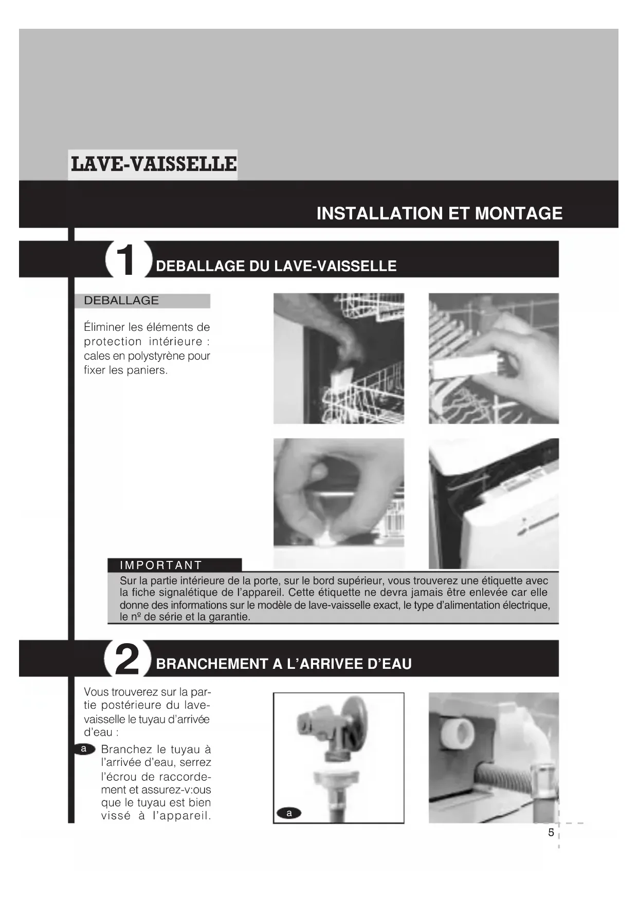 Éliminer les éléments de protection intérieure : cales en polystyrène pour fixer les paniers. Sur la partie intérieure de la porte, sur le bord supérieur, vous trouverez une étiquette avecla fiche signalétique de l’appareil. Cette étiquette ne devra jamais être enlevée car elledonne des informations sur le modèle de lave-vaisselle exact, le type d’alimentation électrique,le nº de série et la garantie.IMPORTANT