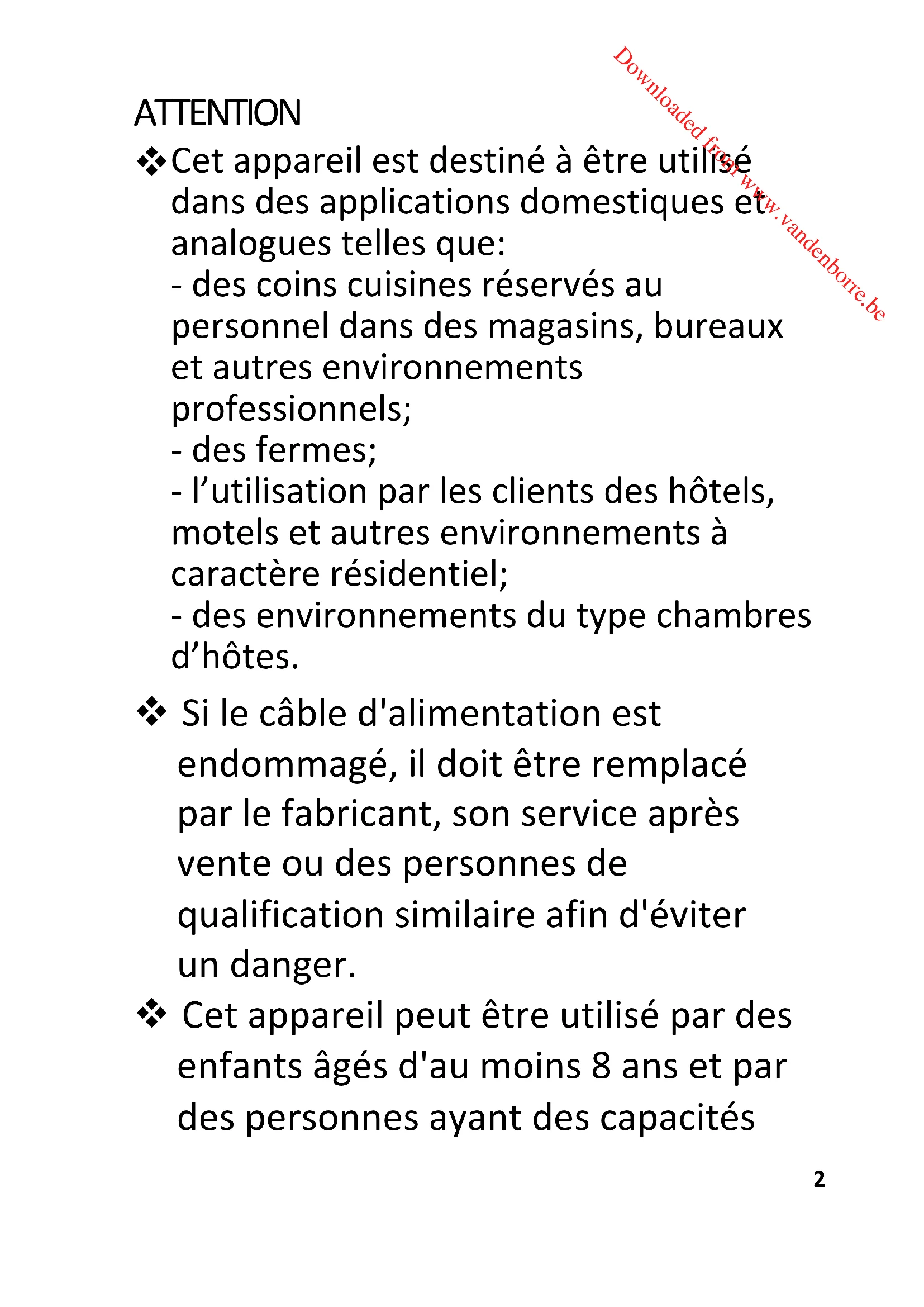 Cet appareil est destiné à être utilisé dans des applications domestiques et analogues telles que: - des coins cuisines réservés au personnel dans des magasins, bureaux et autres environnements professionnels; - des fermes; - l’utilisation par les clients des hôtels, motels et autres environnements à caractère résidentiel; - des environnements du type chambres d’hôtes. Downloaded from www.vandenborre.besont correctement surveillé(e)s ou si des instructions relatives à l'utilisation de l'appareil en toute sécurité leur ont été données et si les risques encourus ont été appréhendés. Les enfants ne doivent pas jouer avec l’appareil. Le nettoyage et l'entretien par l'usager ne doivent pas être effectués par des enfants sans surveillance. Les ouvertures ne doivent pas être obstruées par un tapis.