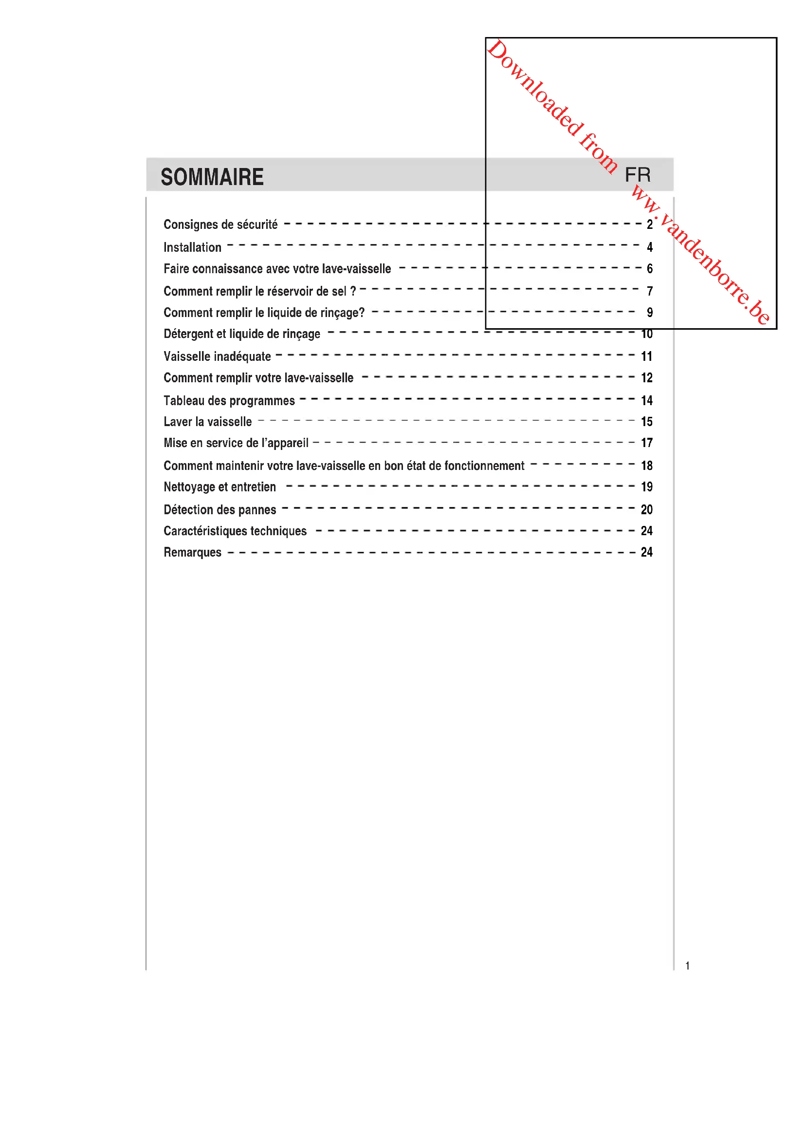 Comment maintenir votre lave-vaisselle en bon état de fonctionnement Après chaque lavage Après chaque lavage, de façon à libérer les moisissures et les odeurs susceptibles de se former à l'intérieur de l'appareil. Débrancher l'appareil Débranchez toujours l'appareil avant de procéder aux opérations de nettoyage ou d'entretien. Ne prenez aucun risque. Éviter les solvants et les produits d'entretien abrasifs Pour le nettoyage de l'extérieur et des parties en caoutchouc de l'appareil, n'utilisez en aucun cas de solvants ou de produits d'entretien abrasifs. Utilisez un chiffon imbibé d'une solution d'eau chaude et de savon. Pour enlever les taches ou salissures présentes sur la surface intérieure de votre appareil, utilisez un chiffon que vous tremperez dans une solution d'eau et de vinaigre blanc, ou un produit d'entretien spécifique pour lave-vaisselle. Comment déplacer votre appareil Si vous devez déplacer votre appareil, veillez à le laisser dans la position verticale. Si cela est absolument nécessaire, il peut éventuellement être posé sur le dos. Joints La présence de résidus d'aliments dans les interstices des joints du lave-vaisselle constitue l'un des facteurs influençant la formation d'odeurs à l'intérieur de celui-ci. Nettoyez régulièrement les joints avec une éponge pour éviter cet inconvénient. Ne laissez pas la porte ouverte puisqu’elle risque de vous trébucher. Absence prolongée En cas d'absence prolongée, il est conseillé de lancer un cycle de lavage à vide, de débrancher l'appareil, de fermer le robinet d'arrivée d'eau et de laisser la porte de l'appareil légèrement entrouverte. Cette précaution permet d'allonger la durabilité des joints et empêche la formation de mauvaises odeurs à l'intérieur du lave-vaisselle. FRDownloaded from www.vandenborre.be