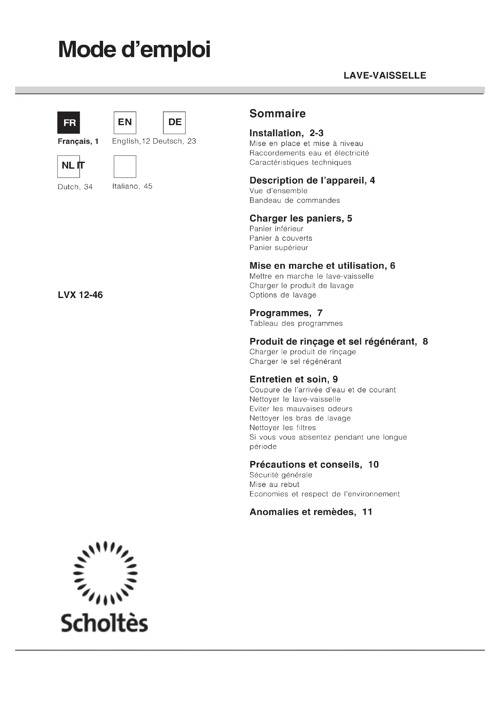LVX 1246 AN WH - Lave-vaisselle SCHOLTES - Notice d'utilisation et mode d'emploi gratuit