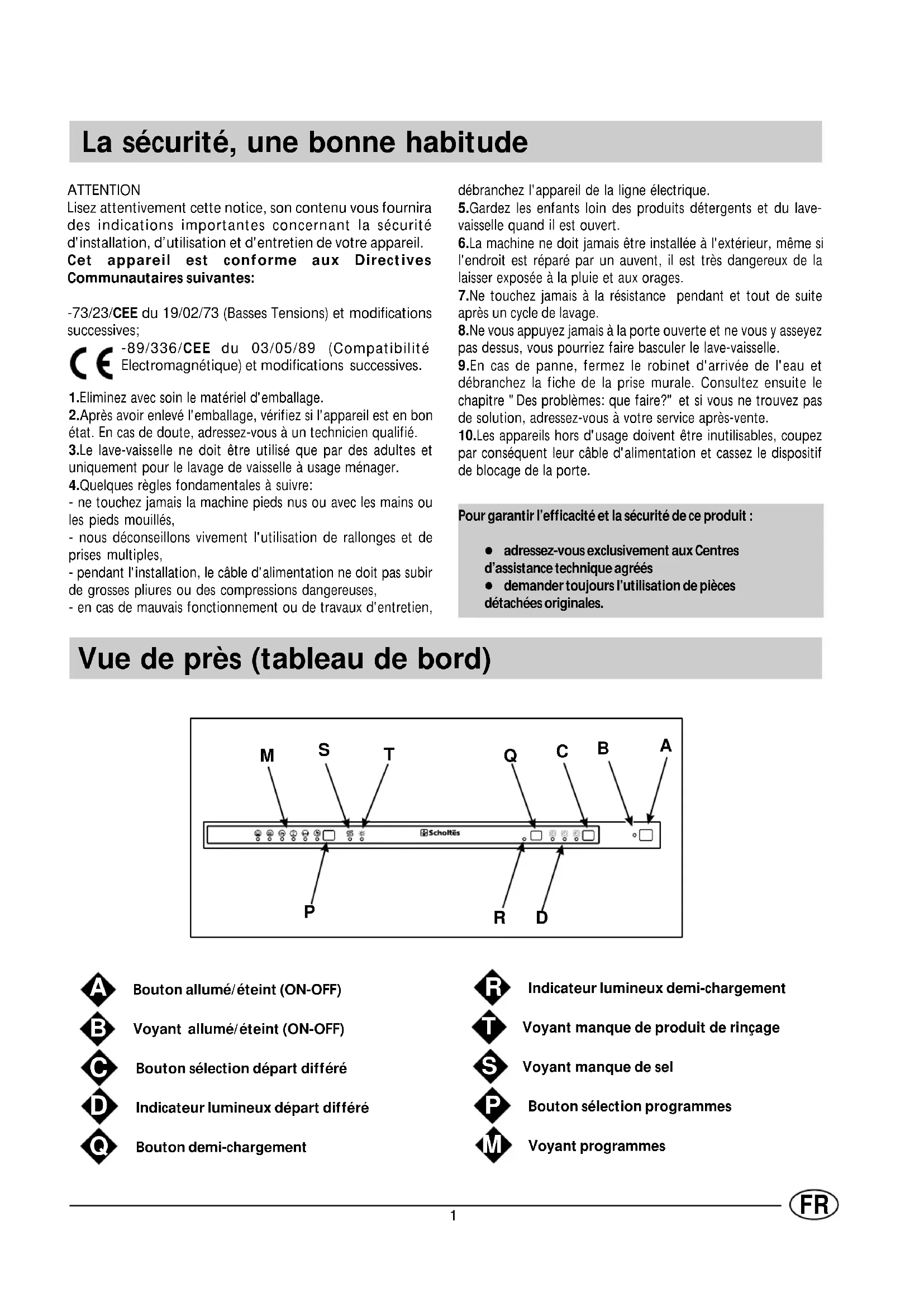 La sécurité, une bonne habitude ATTENTIONLisez attentivement cette notice, son contenu vous fournirades indications importantes concernant la sécuritéd'installation, d’utilisation et d'entretien de votre appareil.Cet appareil est conforme aux DirectivesCommunautaires suivantes:-73/23/CEE du 19/02/73 (Basses Tensions) et modificationssuccessives;-89/336/CEE du 03/05/89 (CompatibilitéElectromagnétique) et modifications successives.Pour garantir l’efficacité et la sécurité de ce produit :l adressez-vous exclusivement aux Centresd’assistance technique agréésl demander toujours l’utilisation de piècesdétachées originales. Vue de près (tableau de bord) 1.Eliminez avec soin le matériel d'emballage.2.Après avoir enlevé l'emballage, vérifiez si l'appareil est en bonétat. En cas de doute, adressez-vous à un technicien qualifié.3.Le lave-vaisselle ne doit être utilisé que par des adultes etuniquement pour le lavage de vaisselle à usage ménager.4.Quelques règles fondamentales à suivre:- ne touchez jamais la machine pieds nus ou avec les mains oules pieds mouillés,- nous déconseillons vivement l'utilisation de rallonges et deprises multiples,- pendant l'installation, le câble d'alimentation ne doit pas subirde grosses pliures ou des compressions dangereuses,- en cas de mauvais fonctionnement ou de travaux d'entretien,débranchez l'appareil de la ligne électrique.5.Gardez les enfants loin des produits détergents et du lave-vaisselle quand il est ouvert.6.La machine ne doit jamais être installée à l'extérieur, même sil'endroit est réparé par un auvent, il est très dangereux de lalaisser exposée à la pluie et aux orages.7.Ne touchez jamais à la résistance pendant et tout de suiteaprès un cycle de lavage.8.Ne vous appuyez jamais à la porte ouverte et ne vous y asseyezpas dessus, vous pourriez faire basculer le lave-vaisselle.9.En cas de panne, fermez le robinet d'arrivée de l'eau etdébranchez la fiche de la prise murale. Consultez ensuite lechapitre "Des problèmes: que faire?" et si vous ne trouvez pasde solution, adressez-vous à votre service après-vente.10.Les appareils hors d'usage doivent être inutilisables, coupezpar conséquent leur câble d'alimentation et cassez le dispositifde blocage de la porte. Bouton allumé/éteint (ON-OFF) Voyant allumé/éteint (ON-OFF) Bouton sélection départ différé Indicateur lumineux départ différé Bouton demi-chargement Indicateur lumineux demi-chargement Voyant manque de produit de rinçage Voyant manque de sel Bouton sélection programmes Voyant programmes