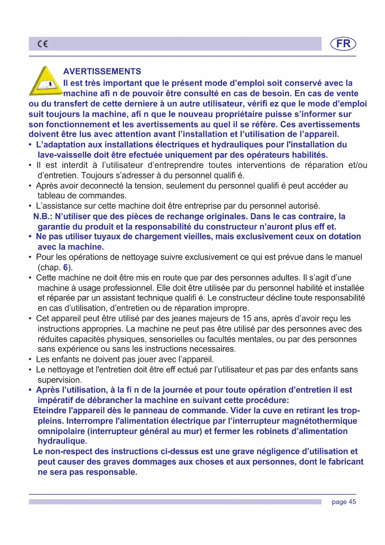 109633Nous vous remercions d'avoir acheté l'un de nos appareils. Les instructions pour l'installation et l'entretien de même que celles pour l'emploi, que vous pourrez lire ci-après, ont été préparées afi n que votre appareil dure longtemps et fonctionne parfaitement. Suivre attentivement ces instructions. Nous avons créé et construit cet appareil selon les dernières innovations technologiques. Votre rôle sera d'en prendre soin. Votre satisfaction sera notre meilleure récompense. LIRE ATTENTIVEMENT LES INSTRUCTIONS AVANT D'INSTALLER LA MACHINE. ATTENTION: LA NON-OBSERVANCE, MEME PARTIELLE, DES NORMES CITEES DANS CETTE NOTICE ANNULE LA GARANTIE DU PRODUIT ET DECHARGE LE PRODUCTEUR DE TOUTE RESPONSABILITE.FR page 43 SOMMAIRE Page AVERTISSEMENTS 45