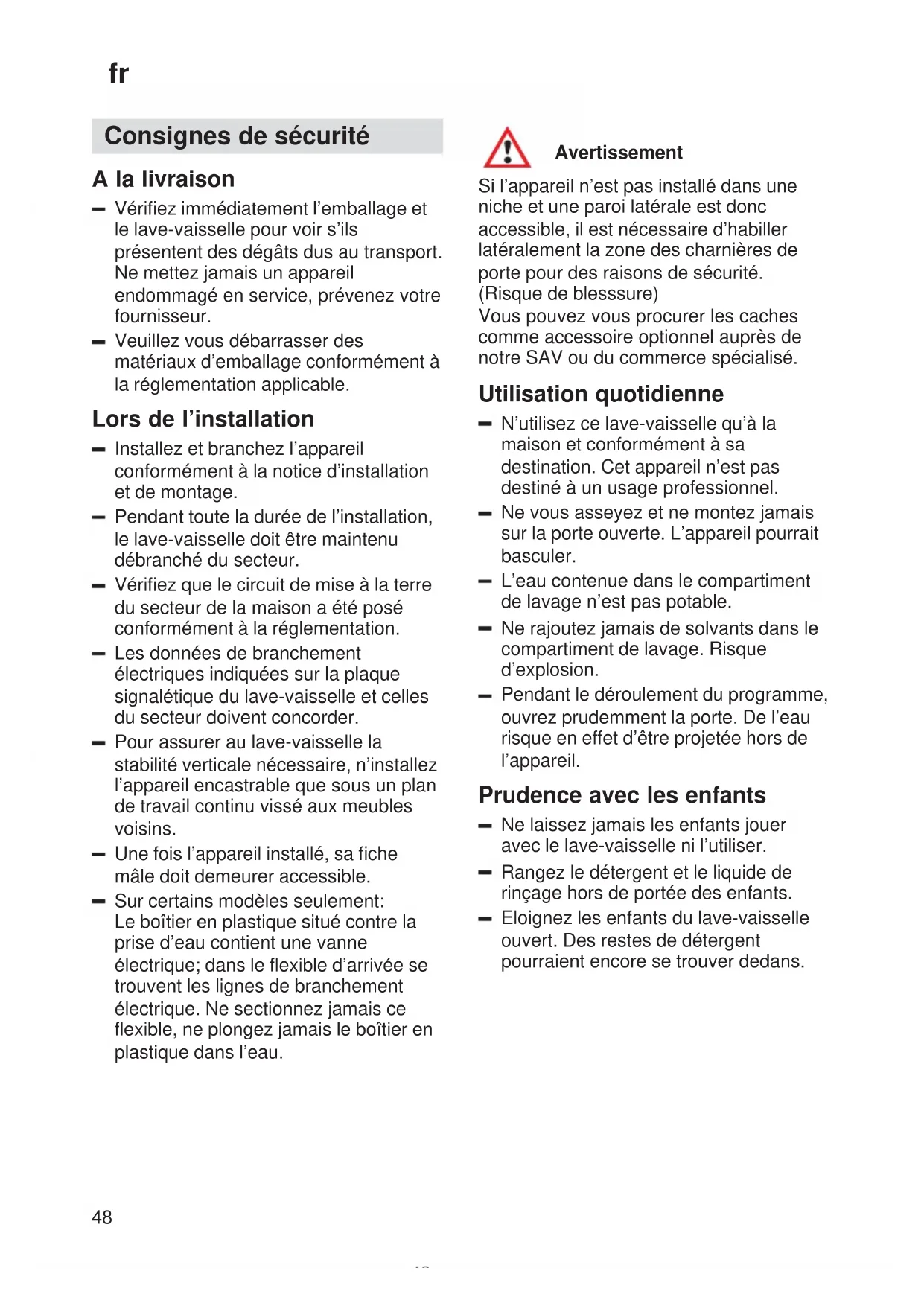 Consignes de sécurité A la livraison Vérifiez immédiatement l’emballage et le lave-vaisselle pour voir s’ils présentent des dégâts dus au transport. Ne mettez jamais un appareil endommagé en service, prévenez votre fournisseur. Veuillez vous débarrasser des matériaux d’emballage conformément à la réglementation applicable. Lors de l’installation Installez et branchez l’appareil conformément à la notice d’installation et de montage. Pendant toute la durée de l’installation, le lave-vaisselle doit être maintenu débranché du secteur. Vérifiez que le circuit de mise à la terre du secteur de la maison a été posé conformément à la réglementation. Les données de branchement électriques indiquées sur la plaque signalétique du lave-vaisselle et celles du secteur doivent concorder. Pour assurer au lave-vaisselle la stabilité verticale nécessaire, n’installez l’appareil encastrable que sous un plan de travail continu vissé aux meubles voisins. Une fois l’appareil installé, sa fiche mâle doit demeurer accessible. Sur certains modèles seulement: Le boîtier en plastique situé contre la prise d’eau contient une vanne électrique; dans le flexible d’arrivée se trouvent les lignes de branchement électrique. Ne sectionnez jamais ce flexible, ne plongez jamais le boîtier en plastique dans l’eau. Avertissement Si l’appareil n’est pas installé dans une niche et une paroi latérale est donc accessible, il est nécessaire d’habiller latéralement la zone des charnières de porte pour des raisons de sécurité. (Risque de blesssure) Vous pouvez vous procurer les caches comme accessoire optionnel auprès de notre SAV ou du commerce spécialisé. Utilisation quotidienne N’utilisez ce lave-vaisselle qu’à la maison et conformément à sa destination. Cet appareil n’est pas destiné à un usage professionnel. Ne vous asseyez et ne montez jamais sur la porte ouverte. L’appareil pourrait basculer. L’eau contenue dans le compartiment de lavage n’est pas potable. Ne rajoutez jamais de solvants dans le compartiment de lavage. Risque d’explosion. Pendant le déroulement du programme, ouvrez prudemment la porte. De l’eau risque en effet d’être projetée hors de l’appareil. Prudence avec les enfants Ne laissez jamais les enfants jouer avec le lave-vaisselle ni l’utiliser. Rangez le détergent et le liquide de rinçage hors de portée des enfants. Eloignez les enfants du lave-vaisselle ouvert. Des restes de détergent pourraient encore se trouver dedans.fr